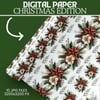 The pattern features a repeating design of poinsettias, holly berries, pine cones, santa, candles, and other festive elements. The colors are a mix of classic Christmas reds and greens, with a touch of gold and white for a vintage feel.