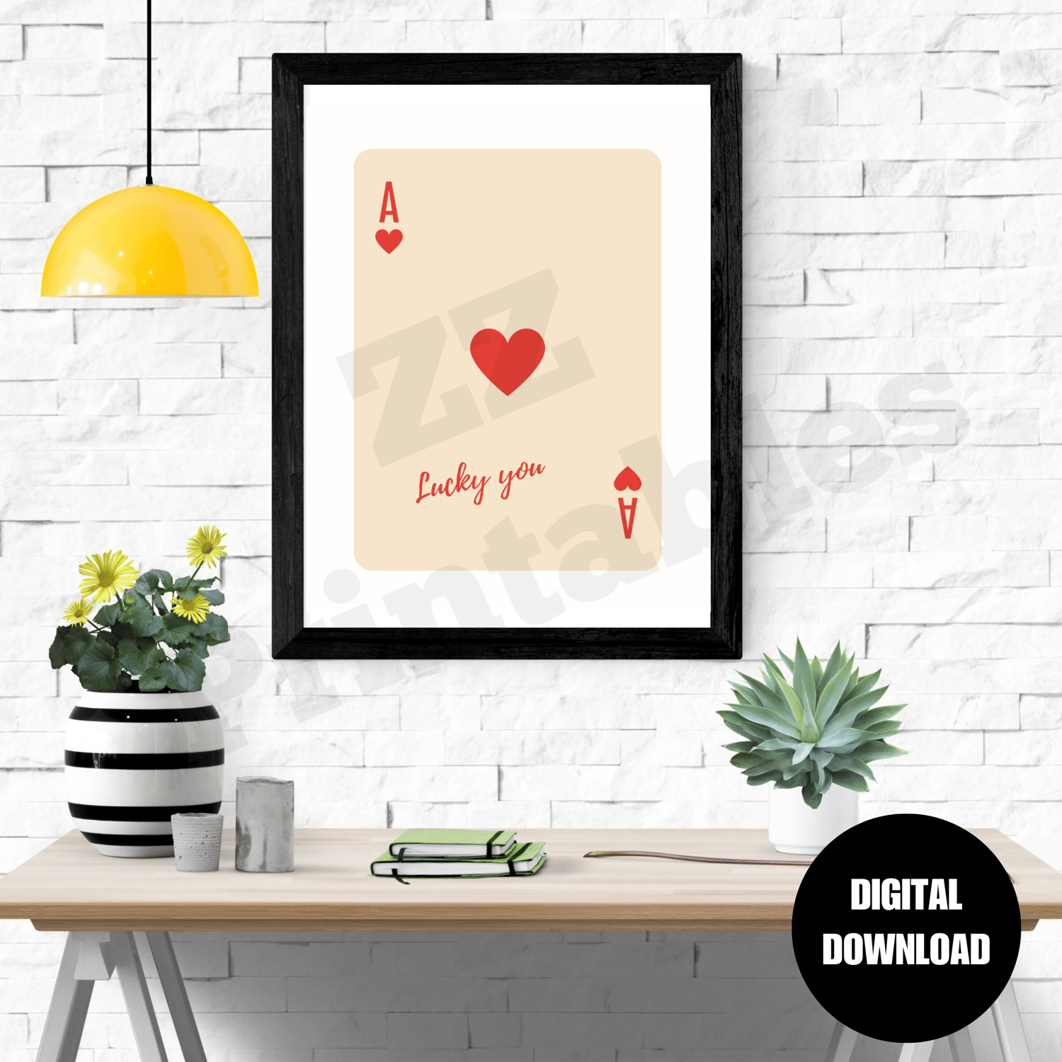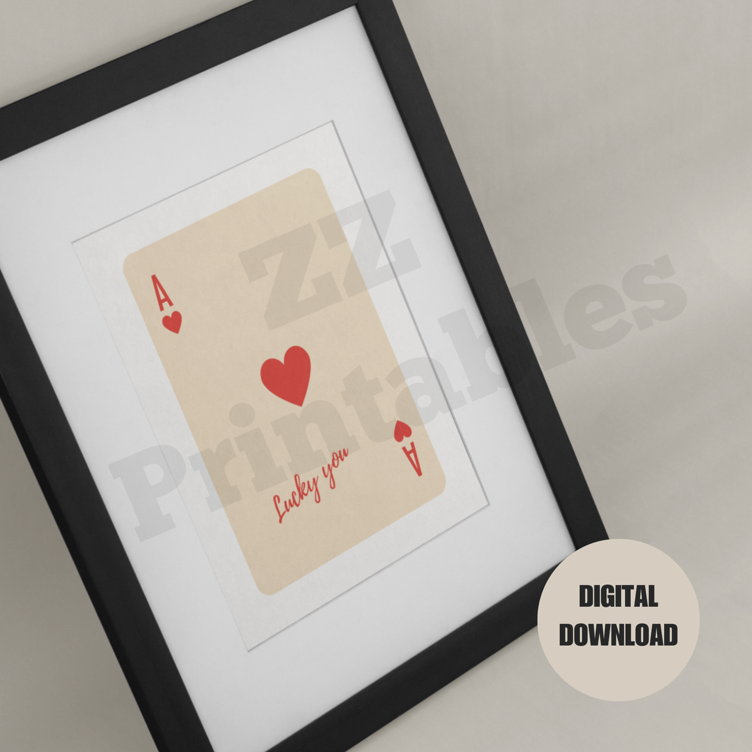 Ace of hearts print lucky you poster red beige trendy retro boho playing card poster home decor printable wall art digital download. The printable comes in 5 different sizes. The digital download consists of a zipped file containing 5 high quality JPEG files (300 dpi) and a PDF size chart to help you choose the right file for the printing size you want.
