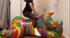 When I first sit on the rhino, it still feels a little wobbly. But since it's so nice and big, I quickly got used to it. It's incredibly comfortable and stable. And off we go! I ride it and try to stay on it as long as possible. It's incredibly fun to hop and ride on the colorful giant rhino.