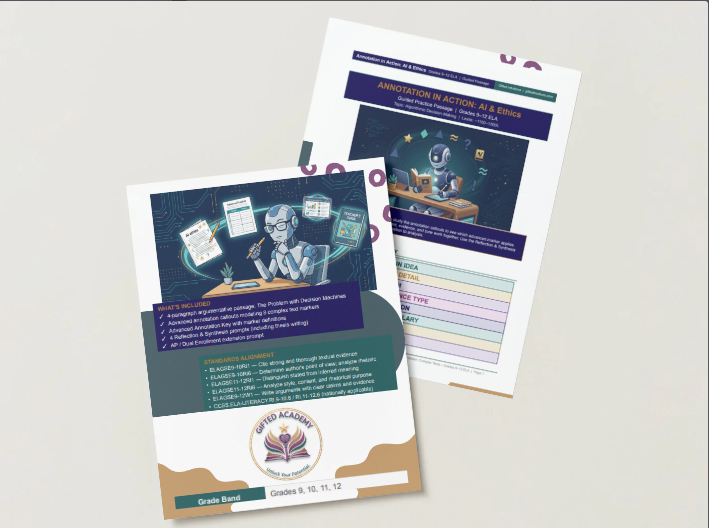 #DocumentDescription1Guided PassageThe Problem with Decision Machines — 8 advanced markers, pre-modeled with callout boxes that explain the analytical insight (not just the symbol)2Advanced Annotation TemplateTwo-column Evidence/Analysis tracker + synthesis prompt for thesis writing3Complex Text Reference Card8 markers with AP/IB rhetorical analysis tips (prints 2 per page)4Teacher Guide20-minute scripted lesson with 4 leveled thesis examples — emerging to advanced analytical writing