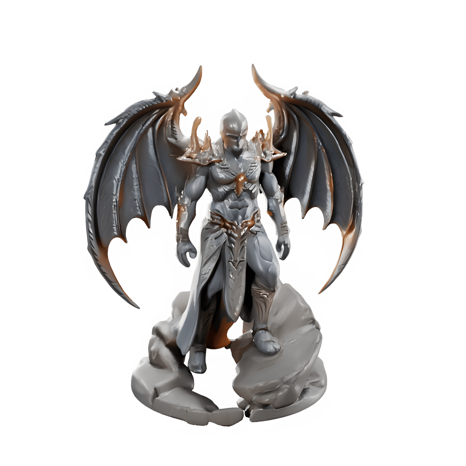 - The Winged Warlord: A commanding figure clad in spiked armor with mighty bat-like wings, standing on a rocky base. Perfect for tabletop gaming or as a display piece.