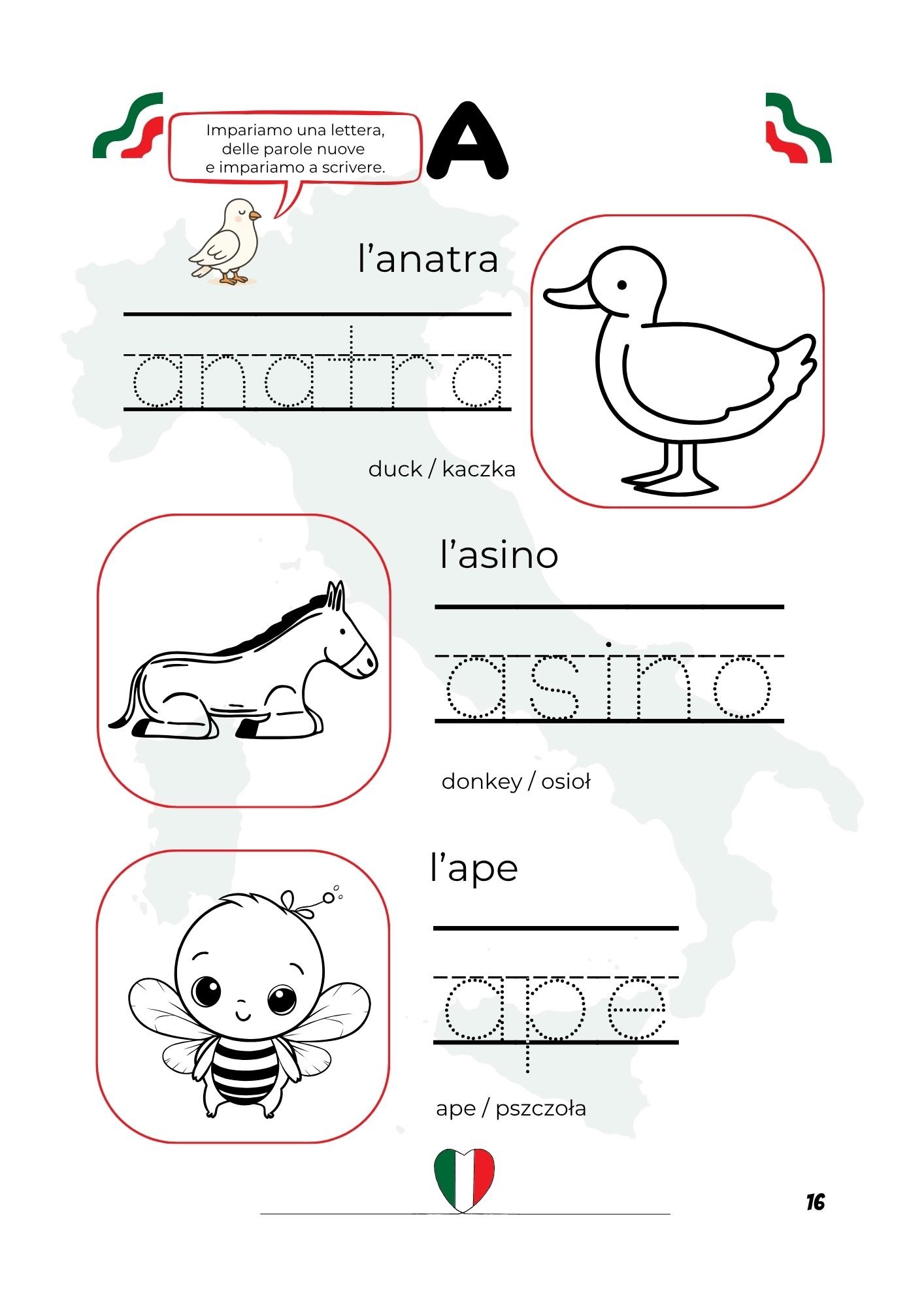 In questo libro si possono imparare le parole che iniziano con la lettera “A”, come Assisi, con traduzioni in inglese e in polacco.