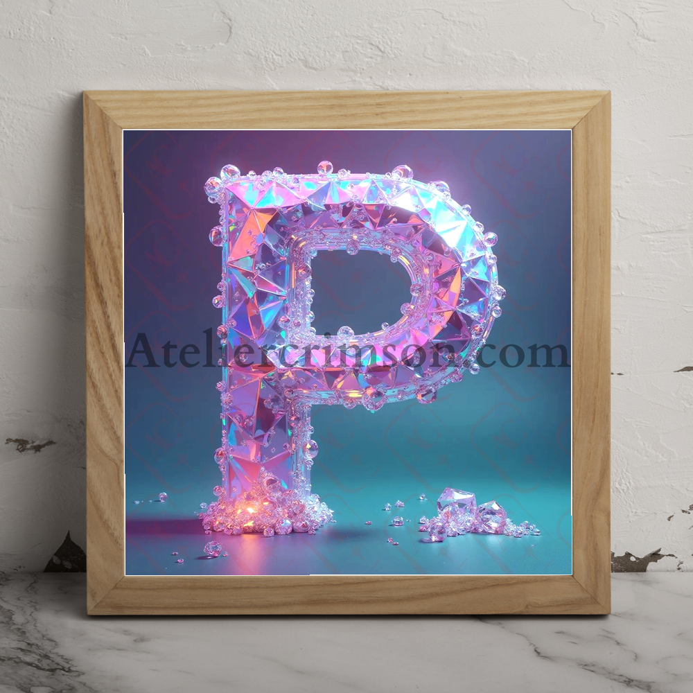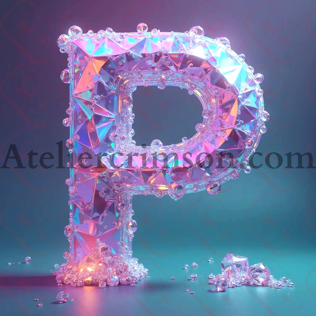 The letter P crystalline Retro Futuristic C A unique creation blending retro-futuristic aesthetics and geometric elegance. Each character is sculpted from iridescent crystals in vibrant, nostalgic hues, set in delicate silver filigree. Against a gradient background transitioning from deep purple to teal blue, this digital artwork captures the essence of 80s-inspired digital art with a touch of crystalline luxury. Perfect for typography enthusiasts, digital art lovers, and those who appreciate retro-futuristic aesthetics.