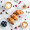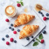Stunning flat lay food photography prompt featuring a luxurious breakfast scene. Croissants, berries, honey and latte art on marble. Bright, airy natural lighting with pastel color palette.