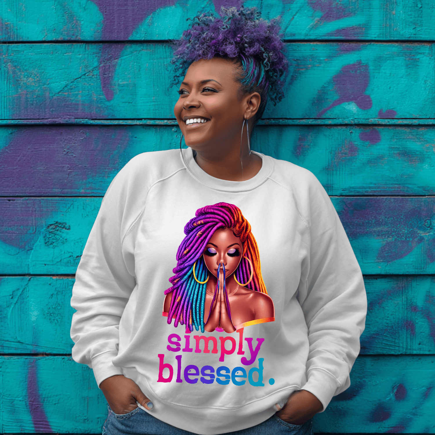 The Simply Blessed design is a beautiful blend of faith, gratitude, and self-assurance. Featuring a serene Black woman with vibrant multicolor locs, eyes closed in prayer, and hands gently clasped, this artwork radiates peace and spiritual confidence. The bold yet soft gradient lettering adds a modern touch while keeping the message grounded and heartfelt.