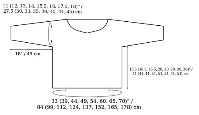 Sizing – The pattern includes 8 sizes ranging from 33” up to 70” and the finished garment is intended to be worn with 4-6 inches (10-15cm) of positive ease so you will need to pick the size that will give you the amount of ease you want (see sizing chart and schematic in the photos on the left). The length of the sleeves (18inches / 45cm) can be easily adjusted to suit your preference and there are notes included on how to adjust the length of the body if you wish to make it shorter/longer.