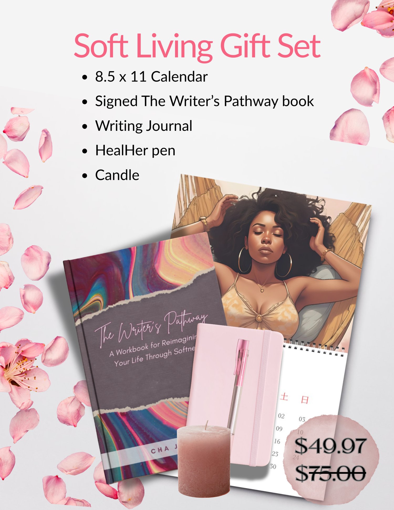 Curated for women ready to reclaim peace and purpose, this bundle includes the Soft Living Calendar, a signed copy of The Writer’s Pathway, a 5x7 blank journal book, and a HealHer writing pen. It’s a sacred invitation to slow down, reflect, and design a life that feels softer and more liberated.