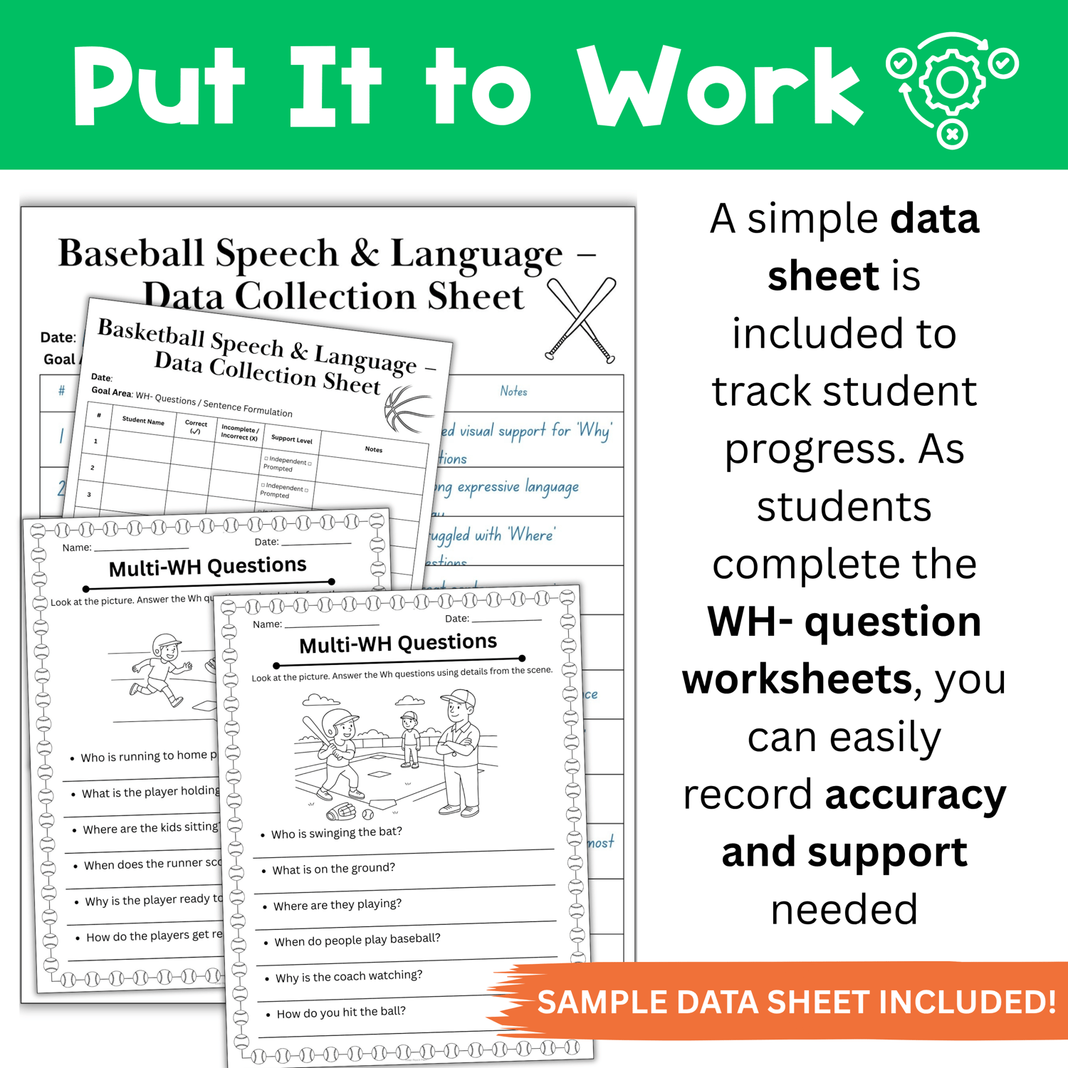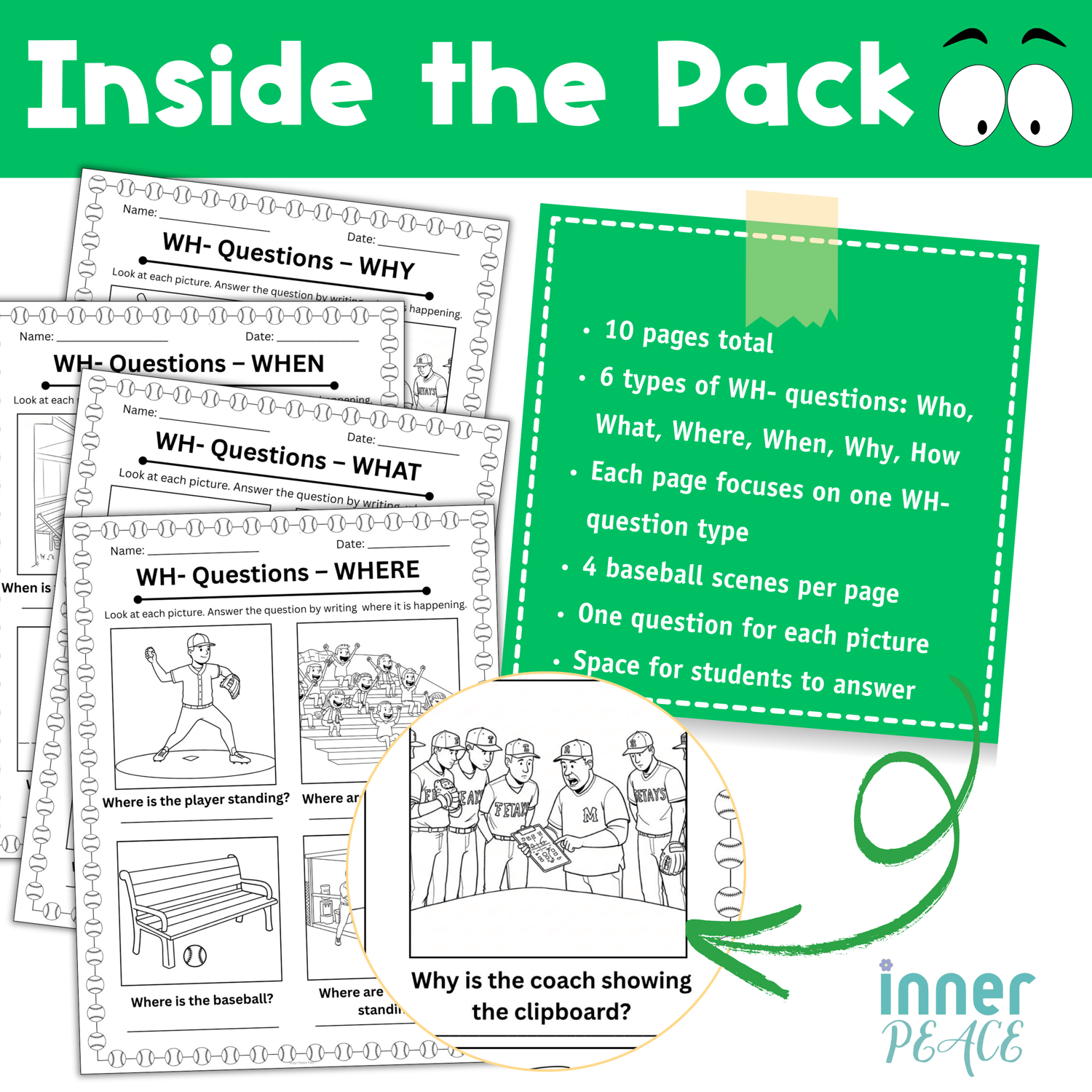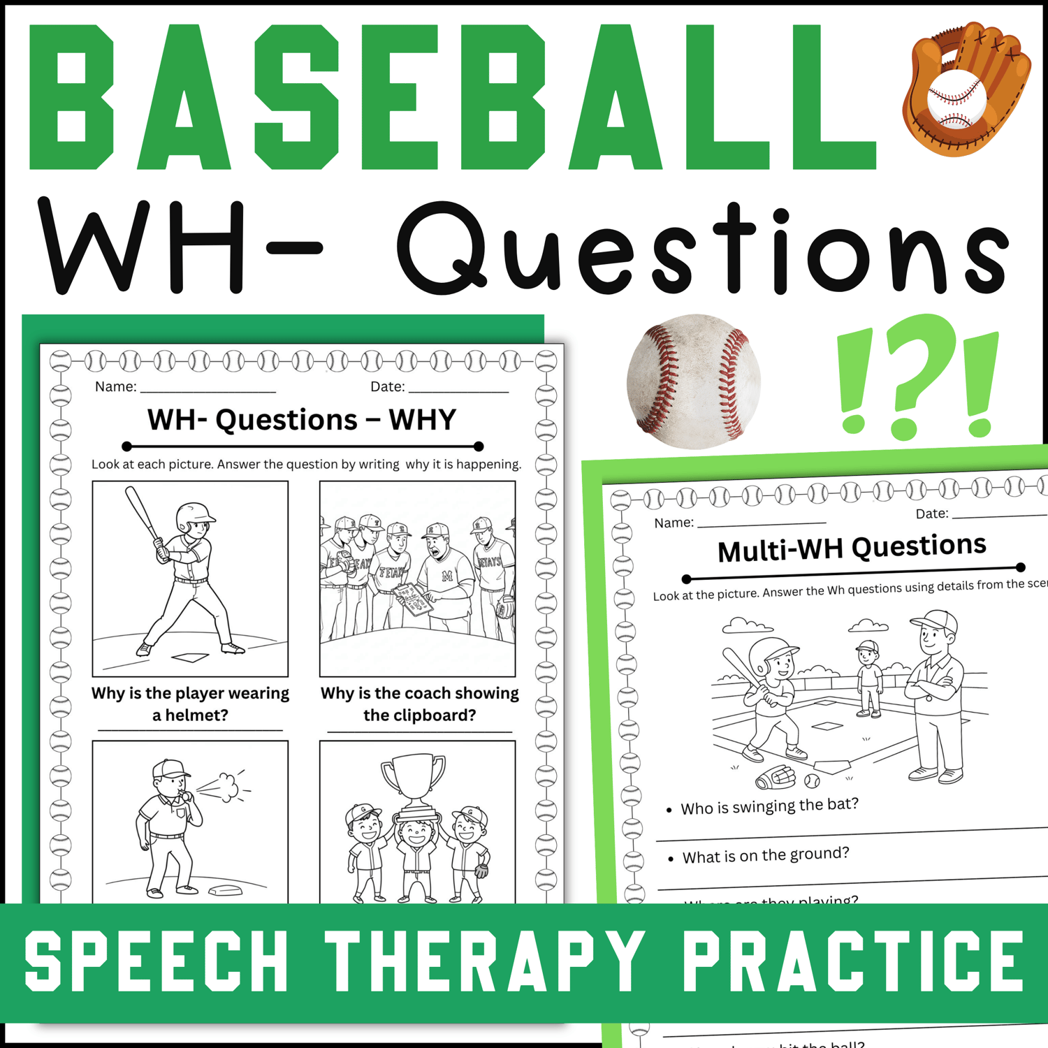 This baseball-themed resource makes learning WH questions fun and easy. Students will look at sports pictures, answer simple questions, and build their language skills. Great for speech therapy, small groups, or classroom language lessons.