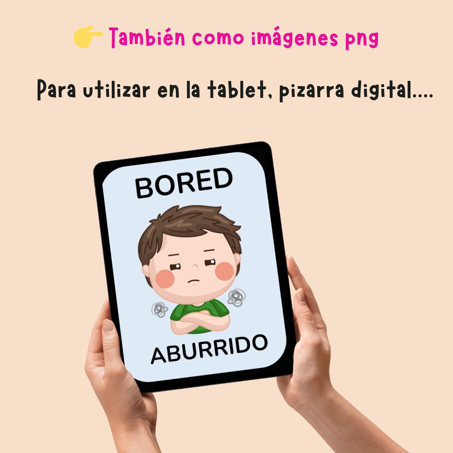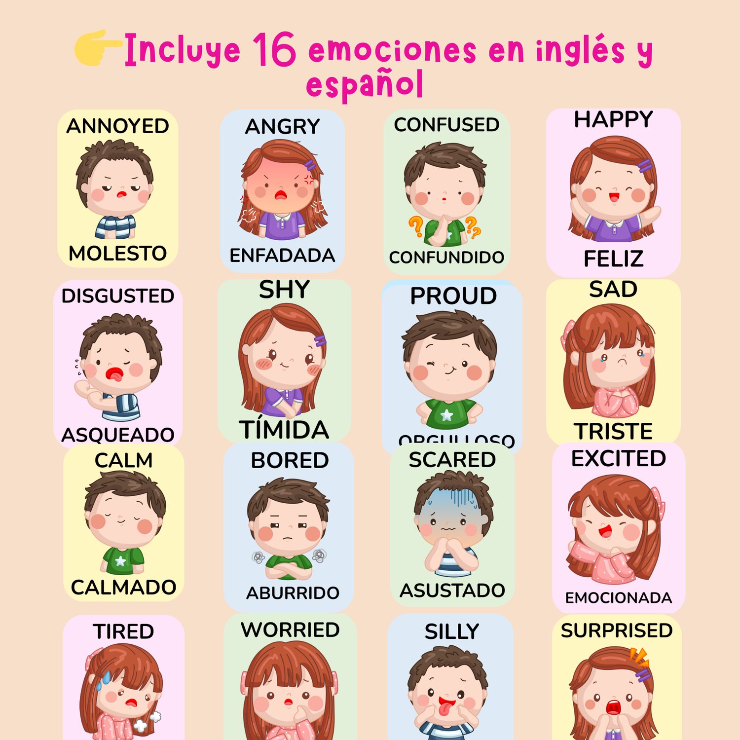 16 tarjetas de emociones bilingües español-inglés en PDF + PNG. Recurso educativo imprimible para niños, aula y educación emocional.
