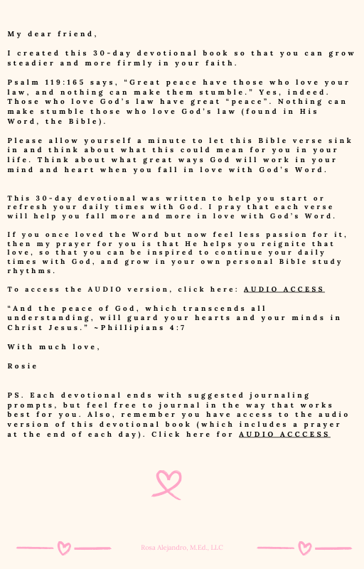 ALLOW ME TO TAKE A MOMENT TO INTRODUCE MYSELF AND TELL YOU WHY I CREATED THIS DEVOTIONAL. I'M ROSA ALEJANDRO, M. ED. I'M A PROUD MOM, WIFE, EDUCATOR, BIBLE STUDY HABIT COACH, SPIRITUAL GROWTH MENTOR, PODCAST HOST OF THE HER FAITH-RESTORED PODCAST, AND MOST IMPORTANTLY, A DEVOTED DISCIPLE OF JESUS. I CREATED THIS PSALM 119 30-DAY DEVOTIONAL SO YOU CAN GROW STEADIER AND MORE FIRMLY IN YOUR FAITH AND SO YOU CAN START DEVELOPING A LASTING BIBLE-STUDYING HABIT THAT CONNECTS YOU DAILY WITH GOD.