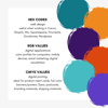 + Detailed Hex Codes, RGB, and CMYK values for each color