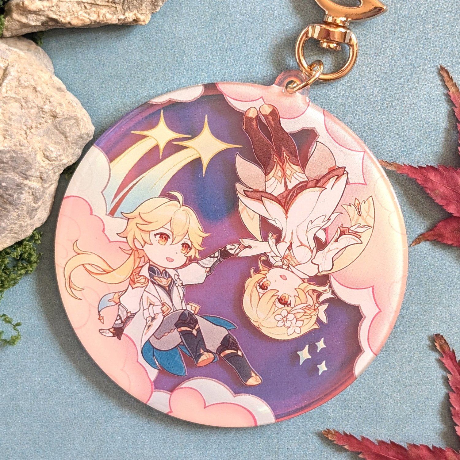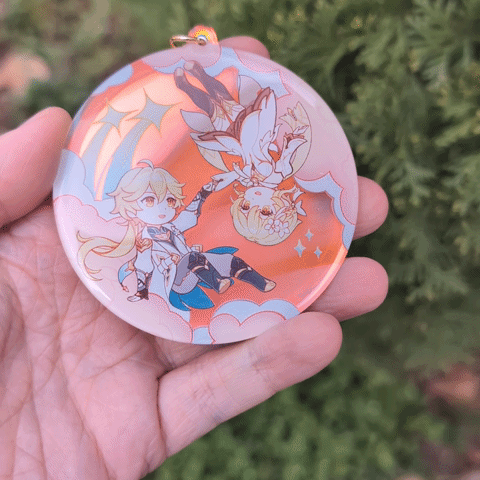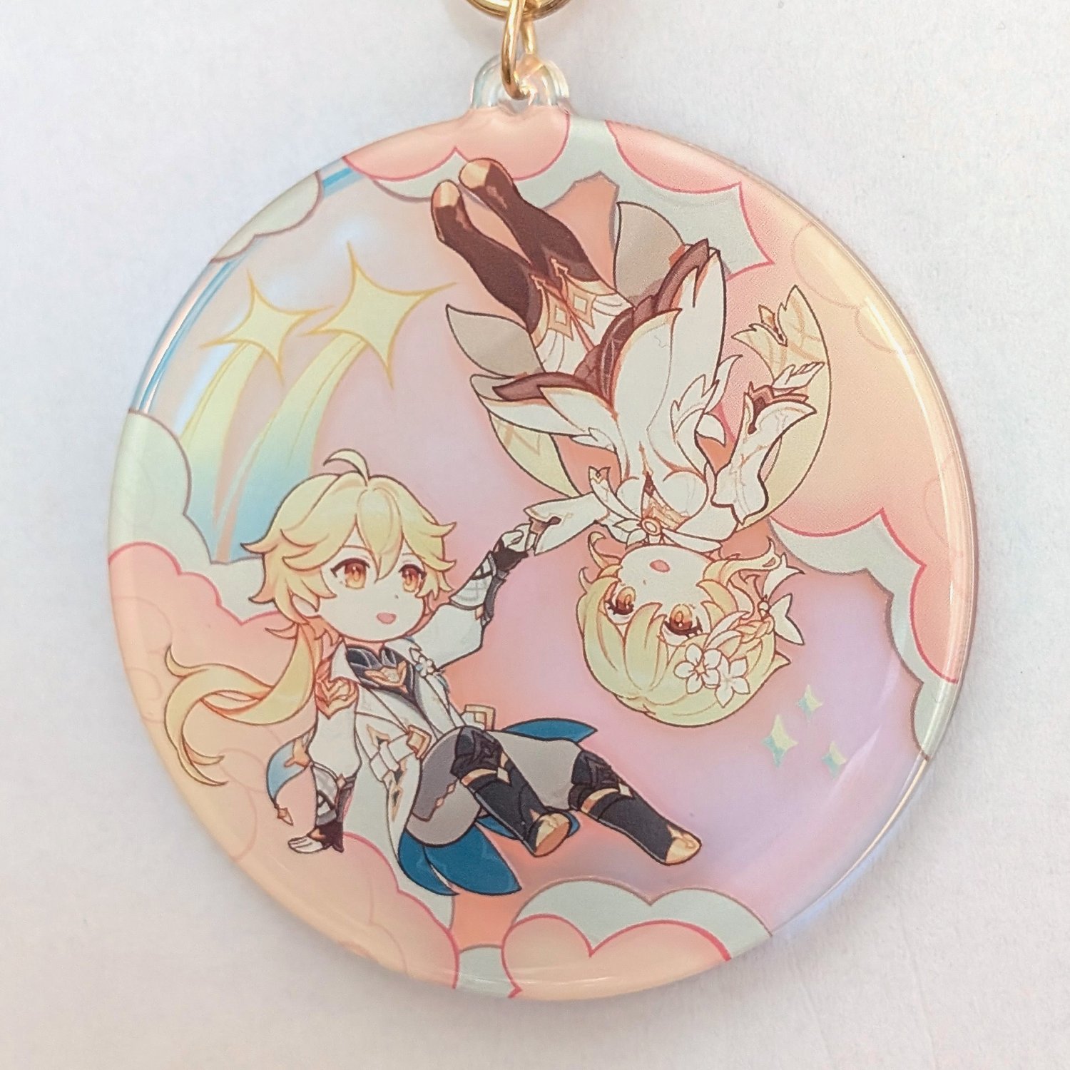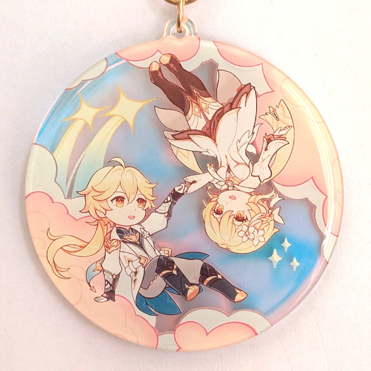 Aether and Lumine holding hands between the clouds. Rainbow acrylic is very reflective in bright light, and translucent in shadow. It gives all sorts of colors from bright orange to sky blue, making the scene look like a shot from a fairy tail.