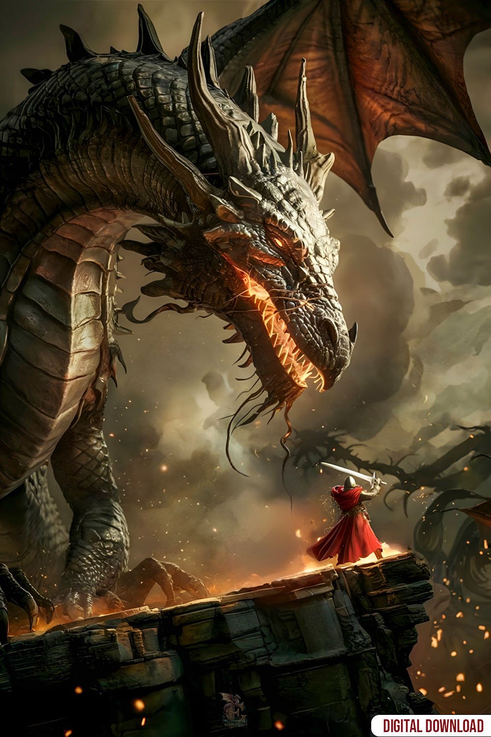 ⚔️ This hyper-detailed fantasy artwork captures the essence of courage, mythic scale, and elemental fury. Perfect for fans of dragon lore, heroic defiance, and cinematic fantasy scenes. Ideal for prints, posters, and storytelling visuals.