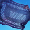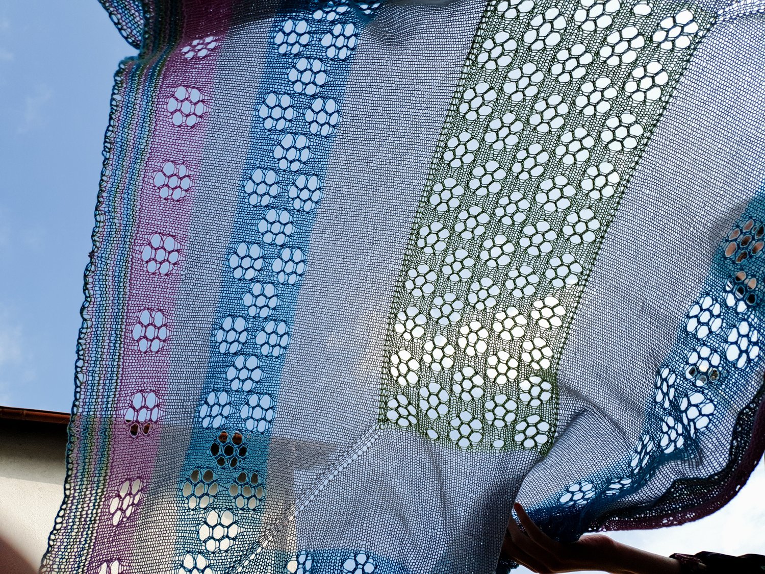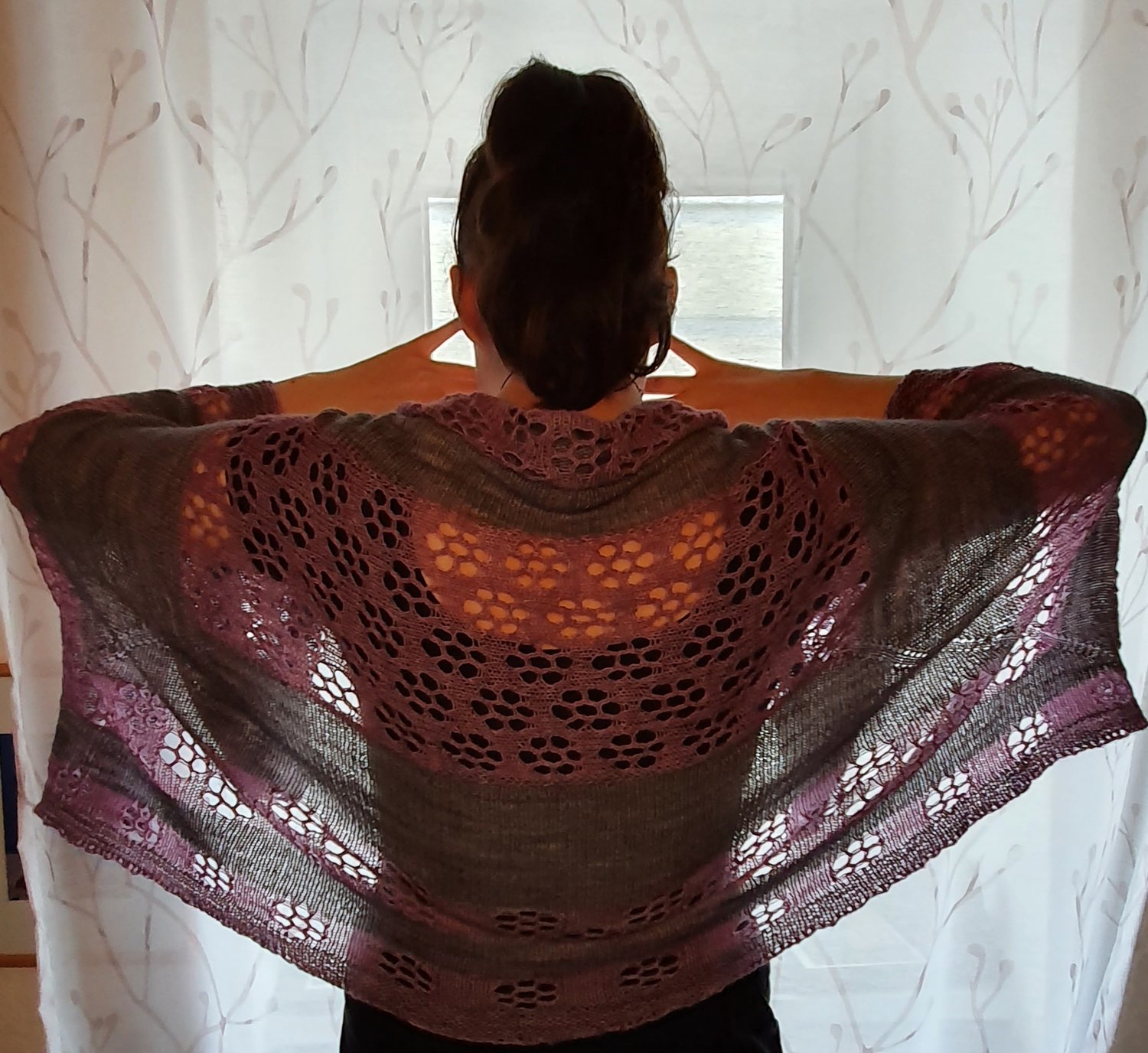 The shawl is composed of a central lace section, surrounded by intervals of stocking stitch and lace, knit in contrasting colours. It is knit from the central section outwards.