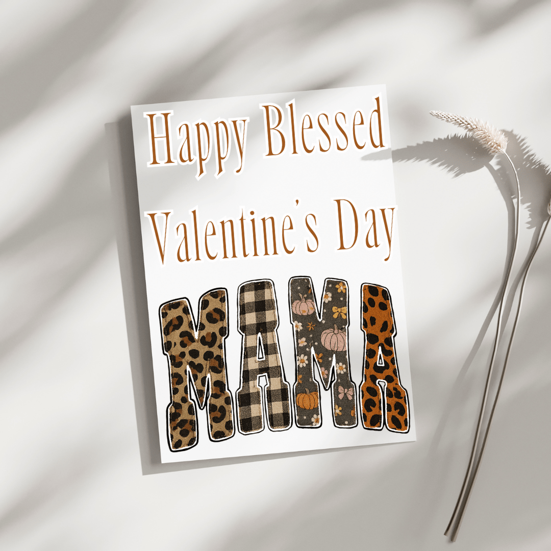 Warm, stylish greeting card designed for a mama who loves cozy, rustic prints with a modern twist. The front reads “Happy Blessed Valentine’s Day” in tall, elegant lettering above bold, patterned block letters that spell MAMA—each letter layered with autumnal buffalo checks, leopard spots, and soft pumpkin florals. Inside is left ready for your personal message. Tuck it into a white envelope and hand it over at a quiet breakfast, a candlelit dinner, or slipped into a bouquet — a gentle note that feels personal and thoughtfully designed.