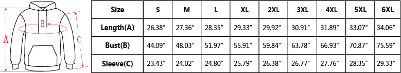 • Sizes: S,M,L,XL,2XL,3XL,4XL,5XL,6XL, Calculate your size from the measurement chart below please.