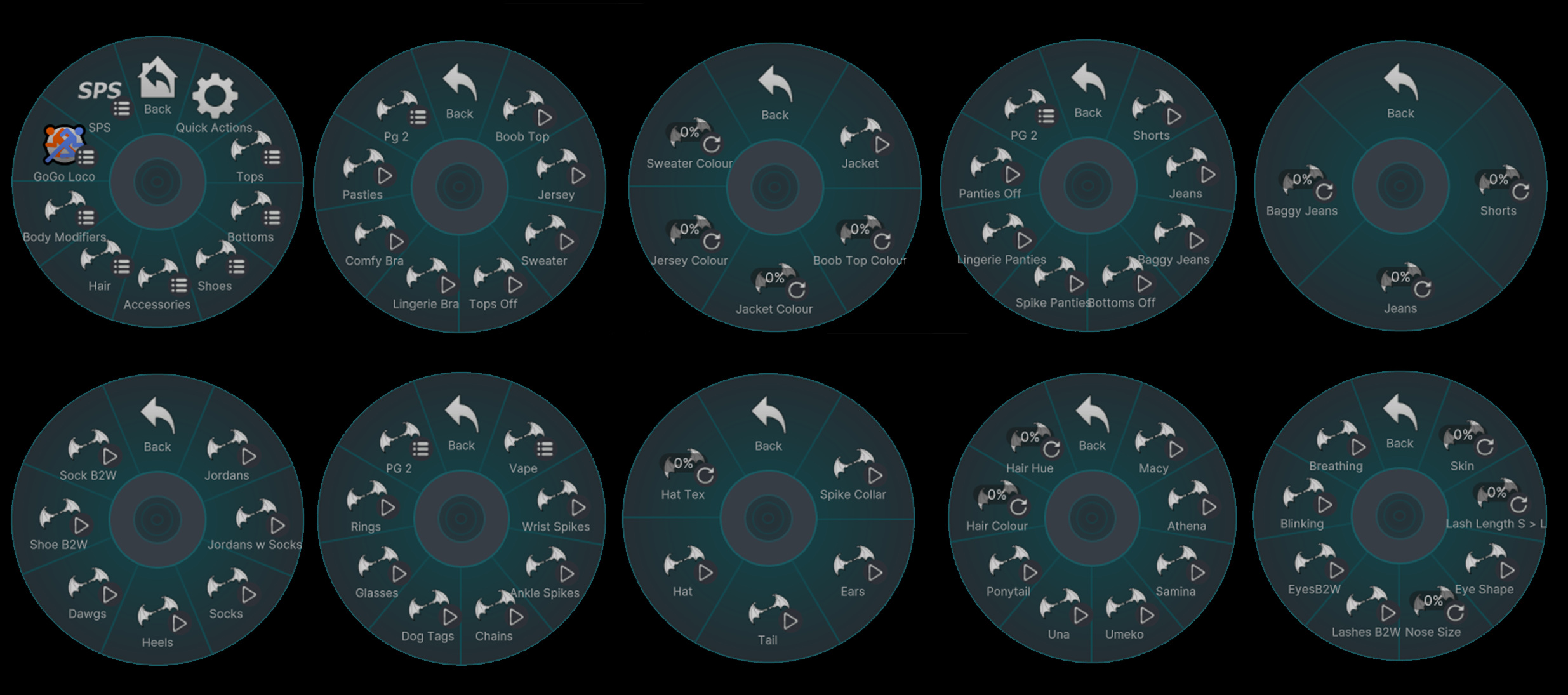 → Wrist spikes, Ankle spikes, Chains, Dog tags, Glasses, Rings, Spike collar, Ears, Tail, Hat