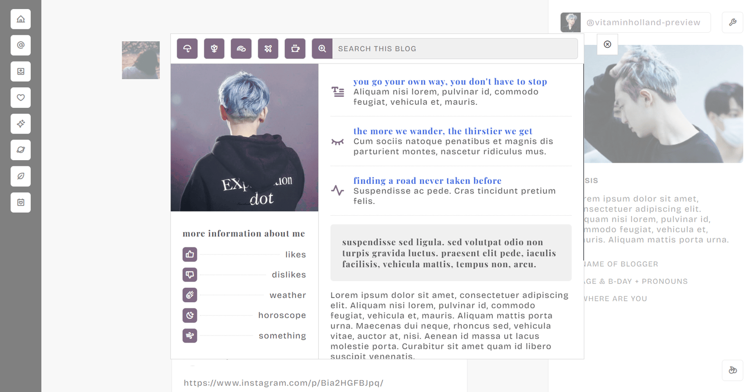 features: 310x200px sidebar image, 34x34px icon image, blog title, three custom links, main about details section, extra five custom links**, search bar, 250x250px about image, more about details section** about section with additional details section, quote section and bio section**, 450px to 540px text posts