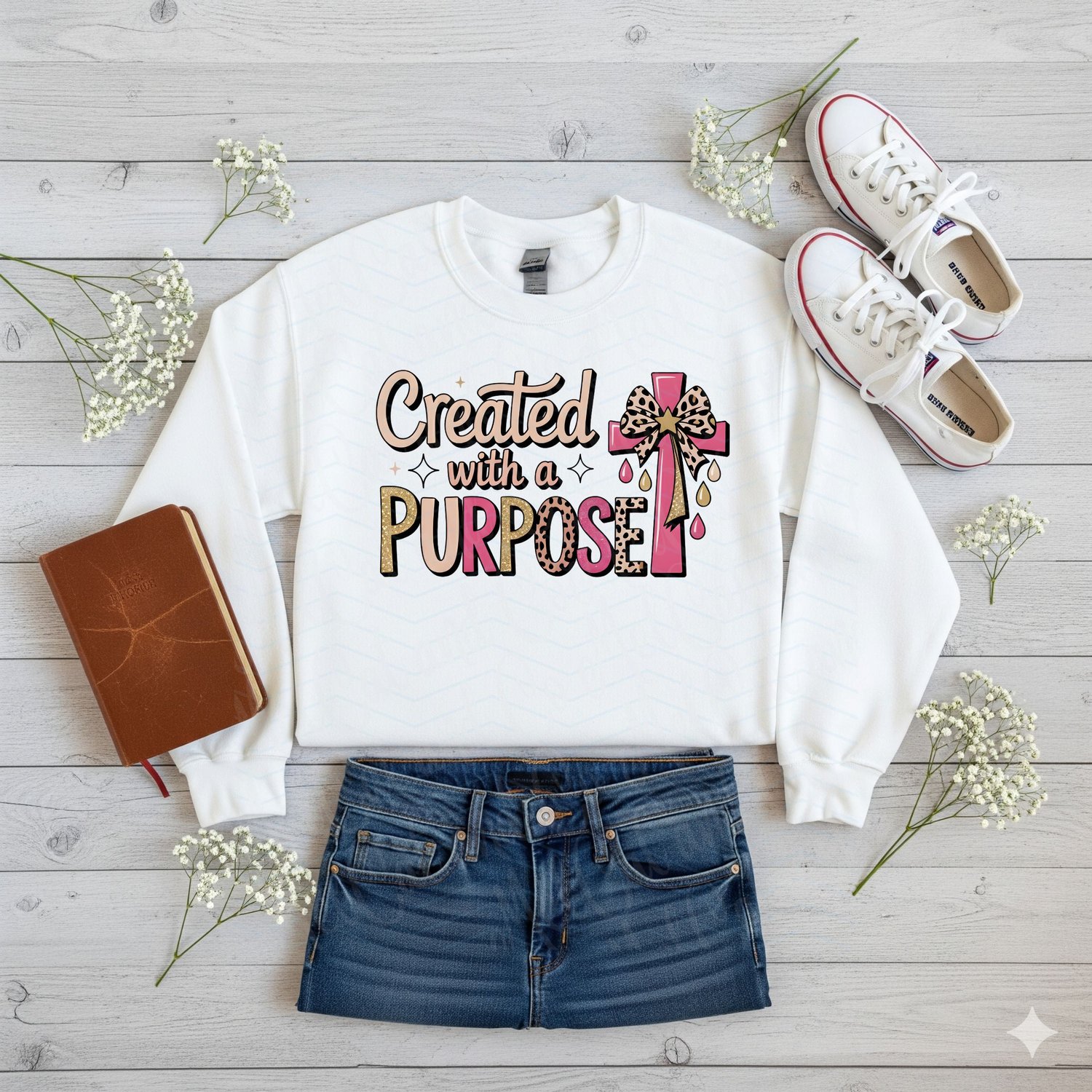 Celebrate faith, purpose, and style with this bold “Created With a Purpose” digital design. Featuring playful hand-lettered typography paired with a stunning pink cross adorned with a leopard-print bow, glitter accents, and soft sparkles, this design blends modern glam aesthetics with an uplifting Christian message.