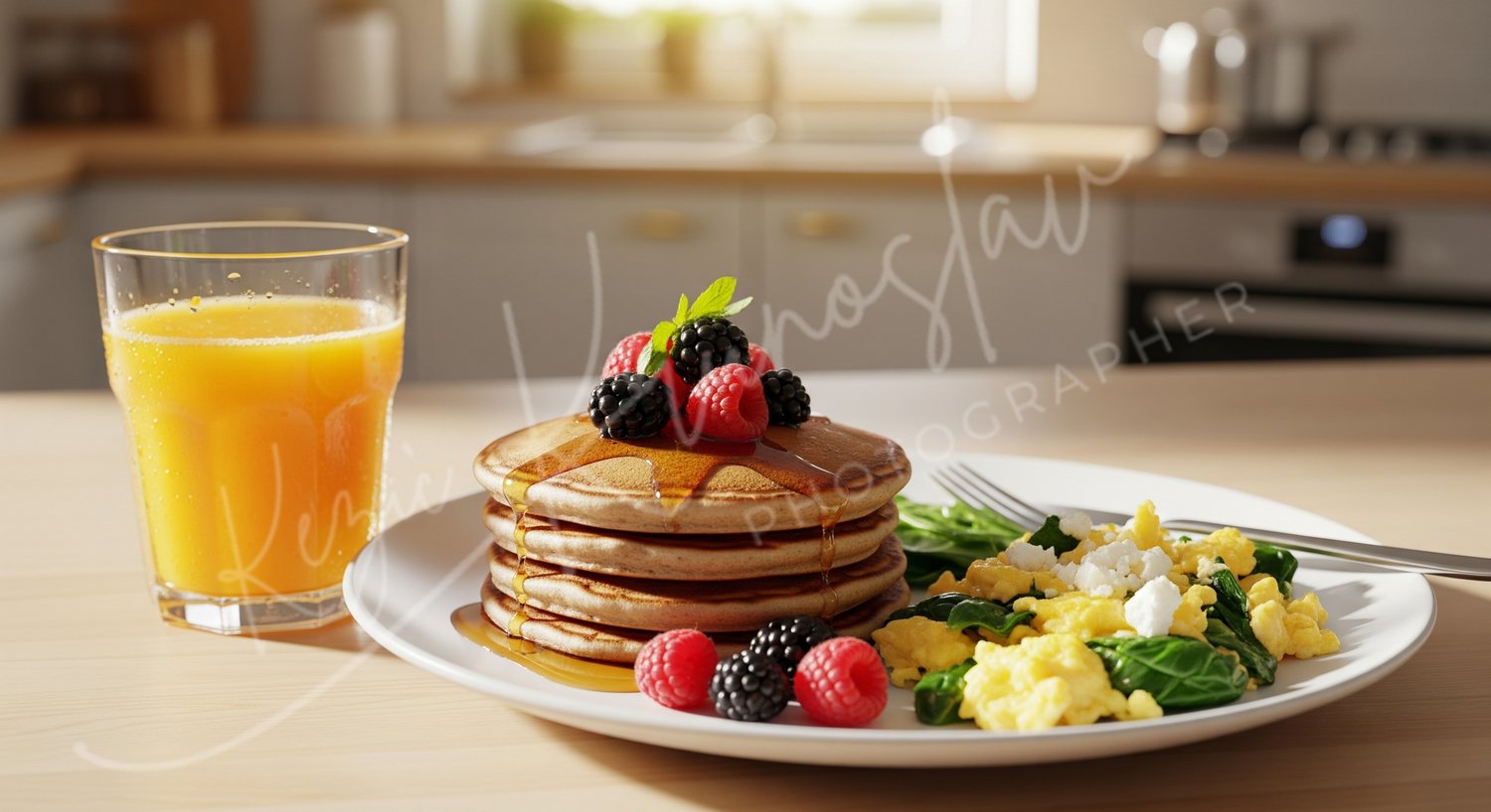 Whole grain pancakes with berries and syrup, served with scrambled eggs, spinach, and orange juice on a wooden table, bright kitchen background.