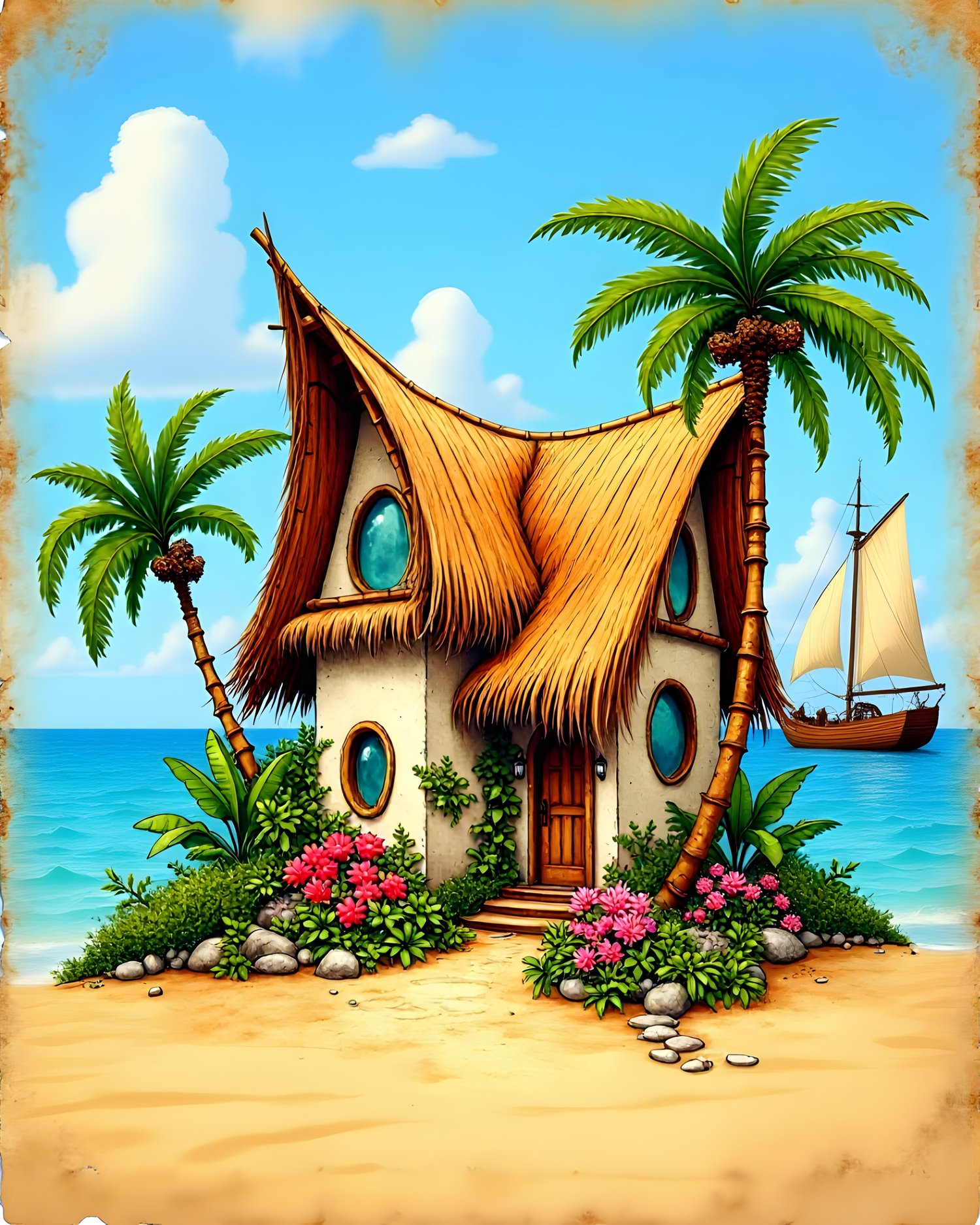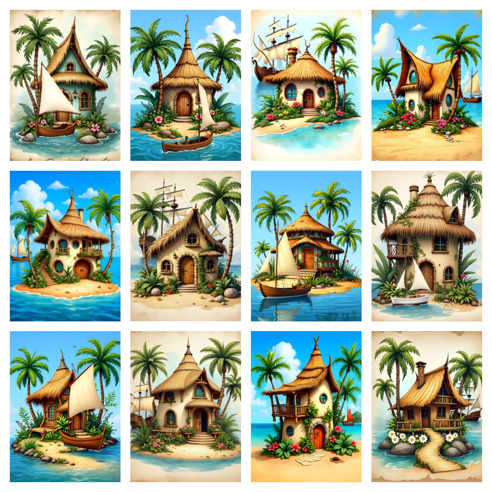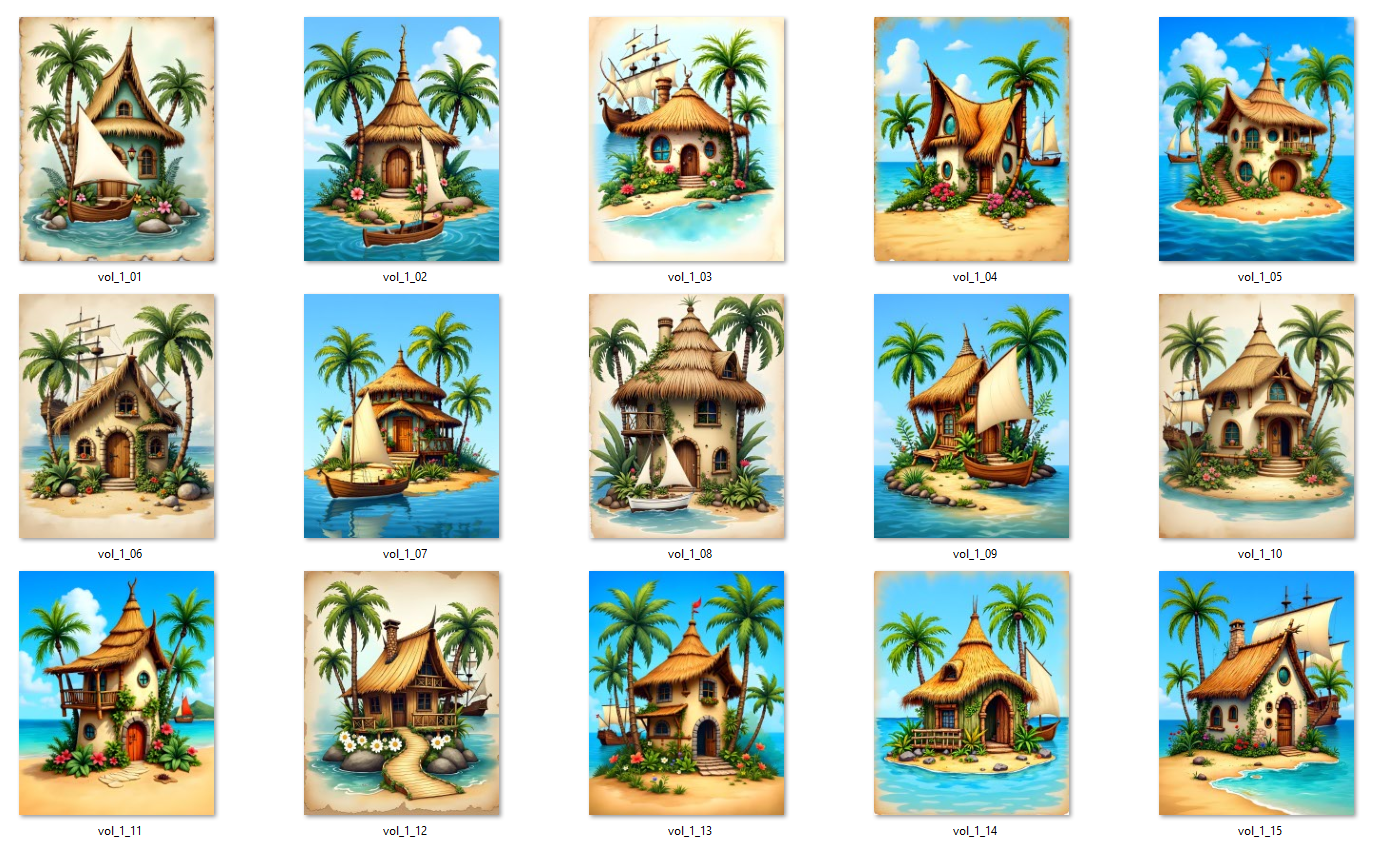 15 AI-generated JPG digital art prints – Tropical Island Cottages Vol. 1 – 15 Kids Beach House Art Prints, digital download, kids wall art. High resolution 300 DPI, 8:10 format, 2400x3000 pixels, ready for print or digital use. Instant download, no physical product. Commercial license included.