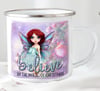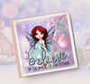 A flat, complete design with “I believe in the magic of Christmas”. Stunning fairy on a colourful Christmassy background.