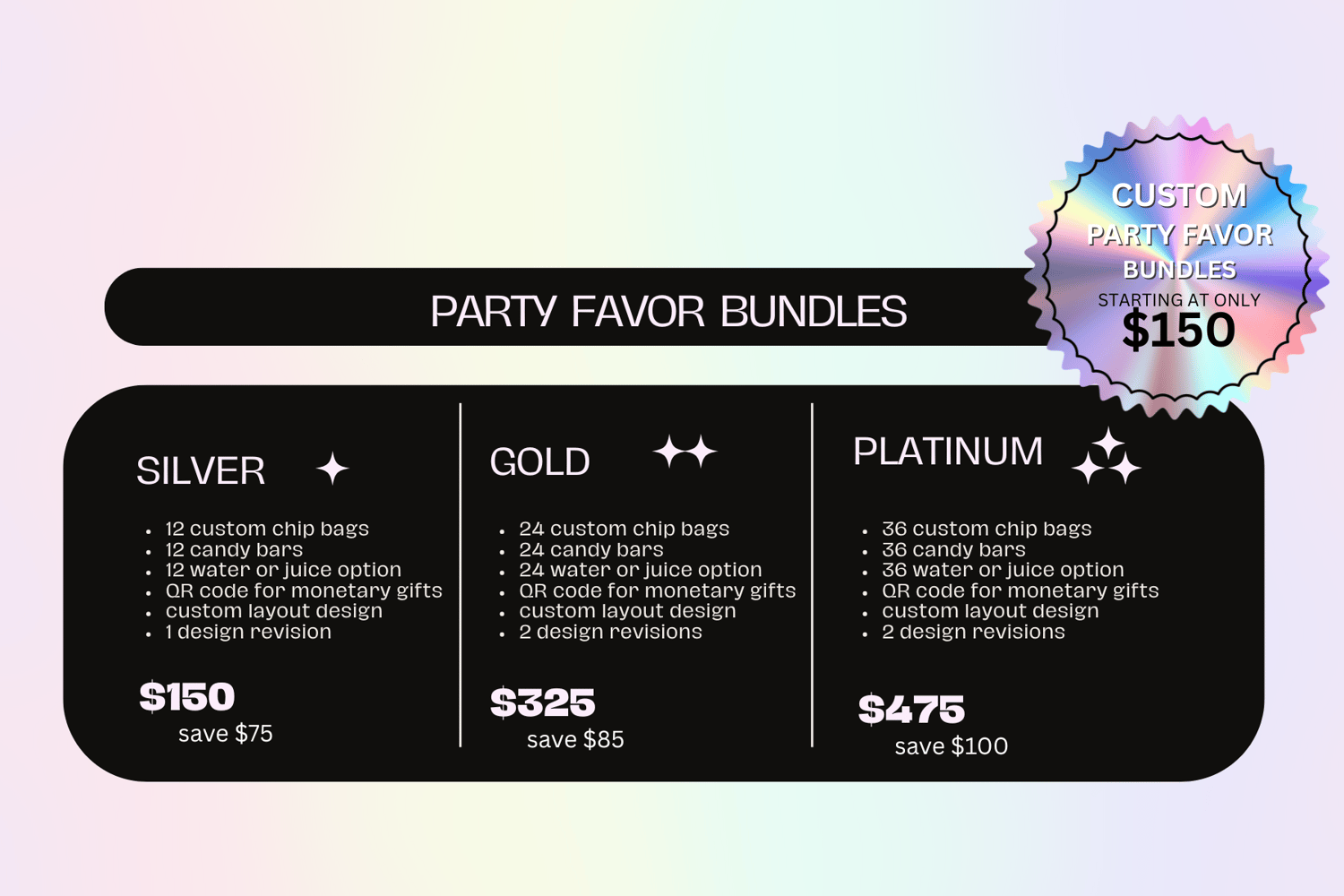 Turn your special moments into unforgettable celebrations with our Custom Party Favor Bundles! Each bundle is designed with love, creativity, and a touch of glam to perfectly match your theme. From birthdays and baby showers to weddings and milestone events, our favors aren’t just treats — they’re memories wrapped in style. With full customization, stunning layouts, and a professional finish, your guests will leave wowed and smiling. See the magic for yourself! Party Favor Magic
