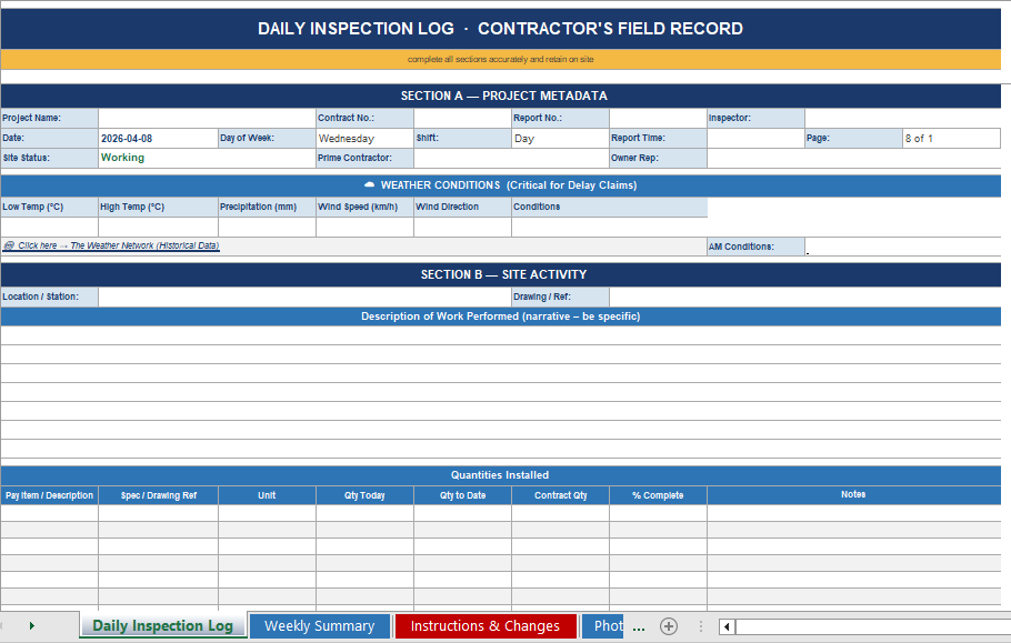 A companion Instructions & Changes Log and Photo Evidence Register are embedded as separate tabs to maintain a running master record across the full duration of the contract, rather than requiring users to search through individual daily sheets.