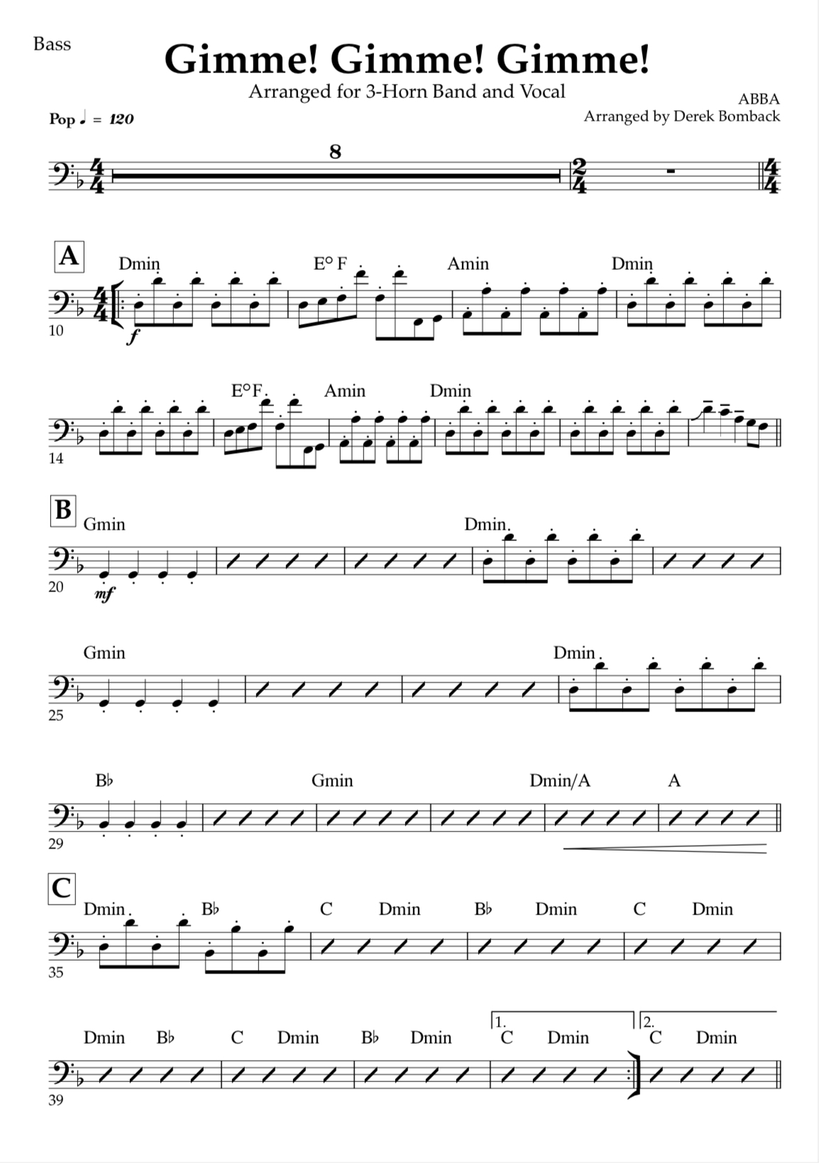 Gimme! Gimme! Gimme! by ABBA. Key of D minor. Arranged for 3 horn band and vocal (Trumpet, Tenor Sax/Flute, Trombone, Guitar, Keyboard, Bass Guitar, Drums & Lyric Sheet).