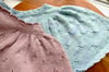 This sweater tee starts at the scalloped neck trim with short rows and gathering added at the top of shoulder to give the sleeves that fun, fluttery shape. All over lace stitch is worked in the round until you split at the underarm. Once the sleeve stitches are placed on hold, the body is worked in the round in the same lace stitch pattern until you bind off at the hem trim with a rib or a scallop edge. The sleeve stitches are then picked up with few rows added for a short sleeve length then finished with a scallop edge stitch bind off.