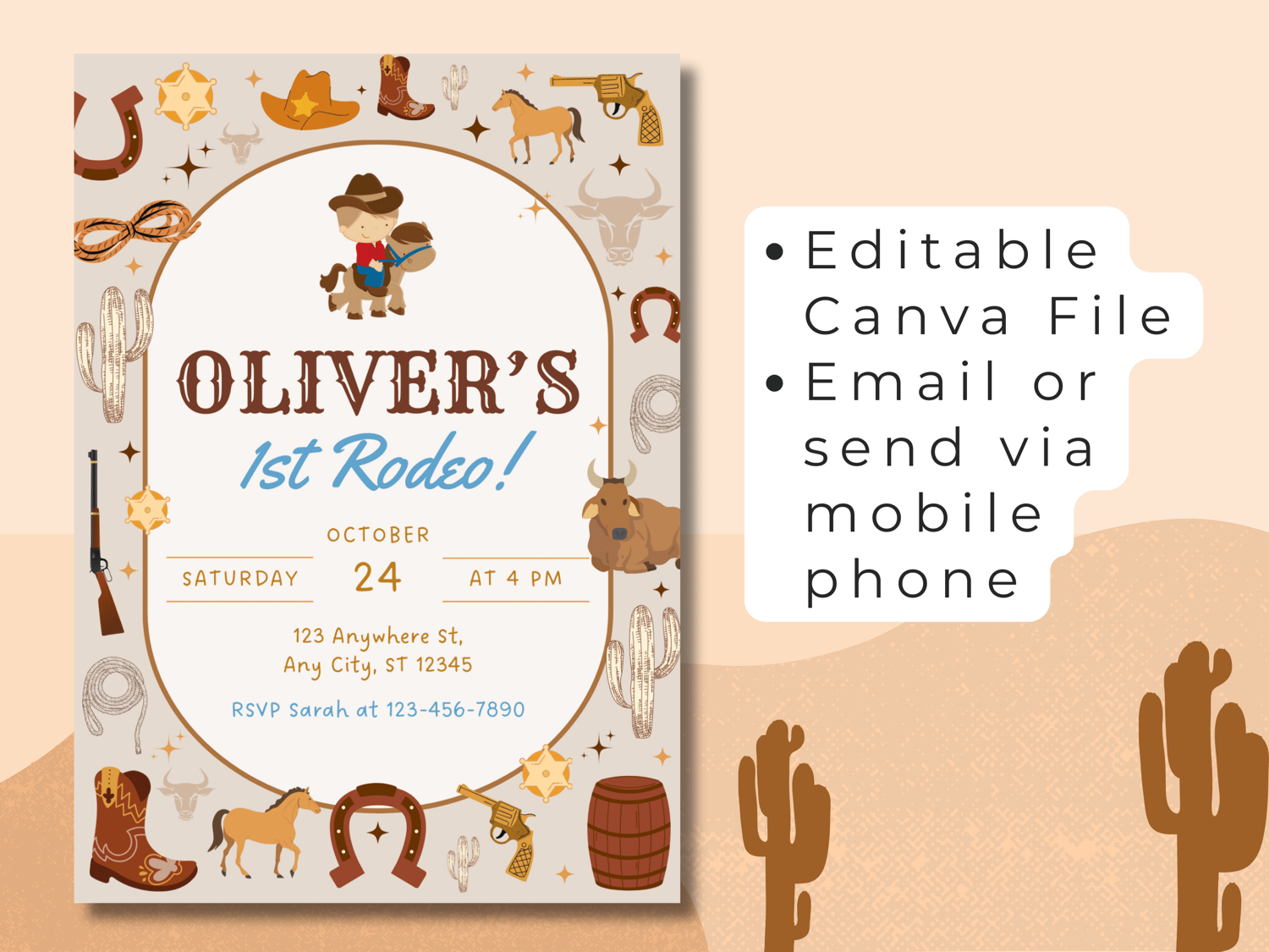 Celebrate your little cowboy's 1st birthday with our My First Rodeo birthday invitation printable! 🐎🤠