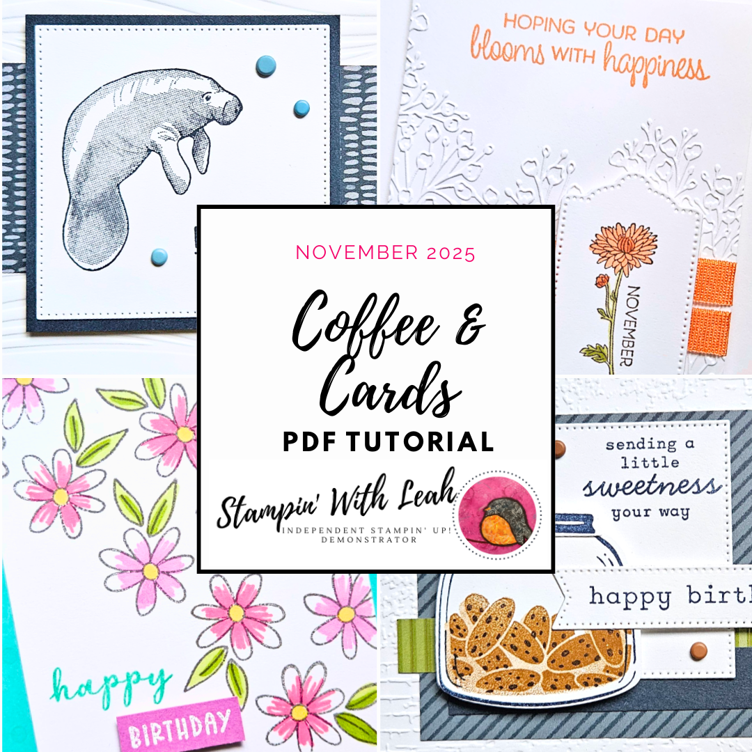 This is a 4 card tutorial for the four unique cards I made for my November Coffee & Cards class. They featured the brand new Big Little Things stamp set, Choose Happy stamp set, Sweet Jar stamp set and punch bundle, and the recently retired Year of Flowers bundle. The PDF Tutorial includes a full list of supplies used as well as dimensions and clear instructions. All of these products are from Stampin' Up! and can be purchased through me (subject to availability) if you live in Canada. https://leahdixon.stampinup.net/