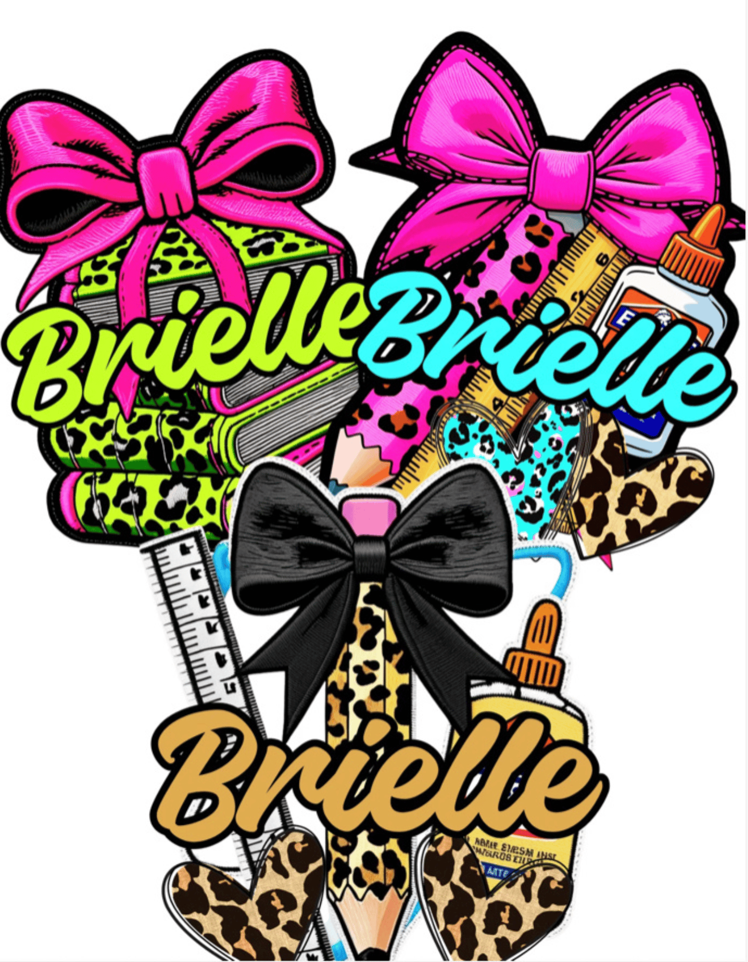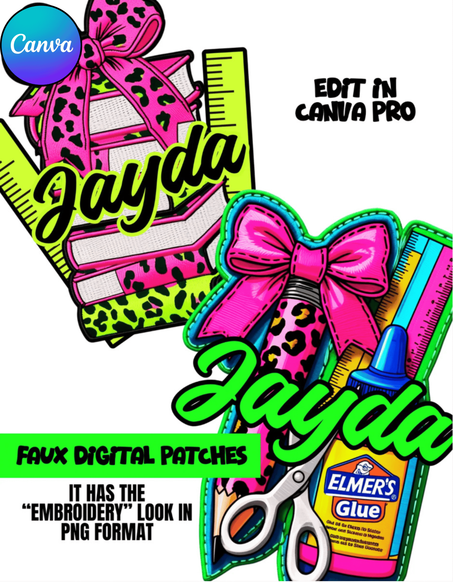 This digital bundle includes scissors, glue, notebooks, rulers, bows, and neon leopard print all designed to look like real embroidery without the thread! Perfect for stickers, sublimation projects, labels, shirts, digital scrapbooking, and more.