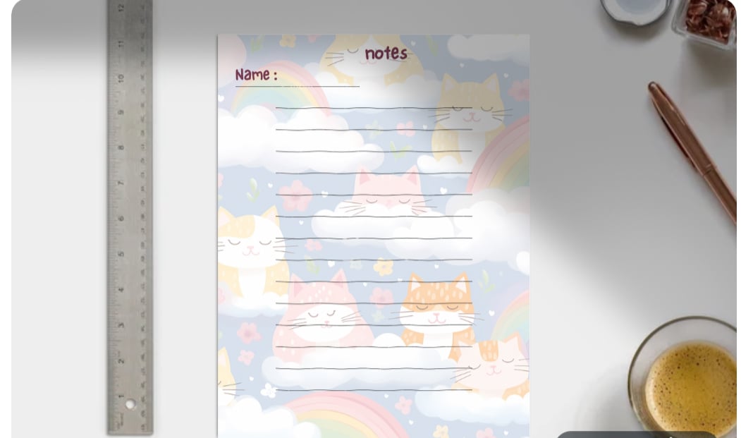 A delightful cat-themed notebook page designed to make writing more fun! With adorable kittens at the top and a cheerful cat illustration at the bottom, this page is perfect for kids or cat lovers to jot down daily notes, doodles, or journal entries. The soft pink paw print background adds a cozy, playful touch to your creative writing moments.