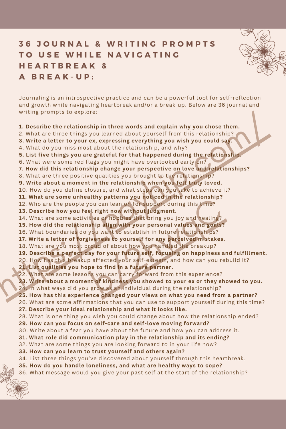 36 Heartbreak Journal Prompts: Navigating Breakups (Worksheet)