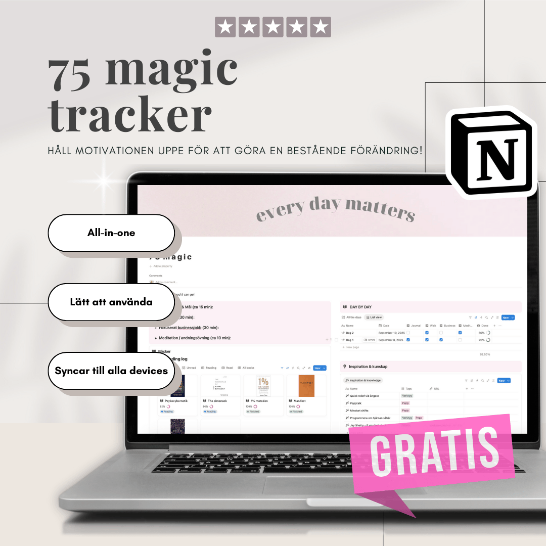 Med denna 75 MAGIC Challenge Tracker i Notion får du en motiverande och enkel struktur som håller dig på banan under hela din resa. Allt du behöver för att klara utmaningen – och fortsätta växa efteråt.