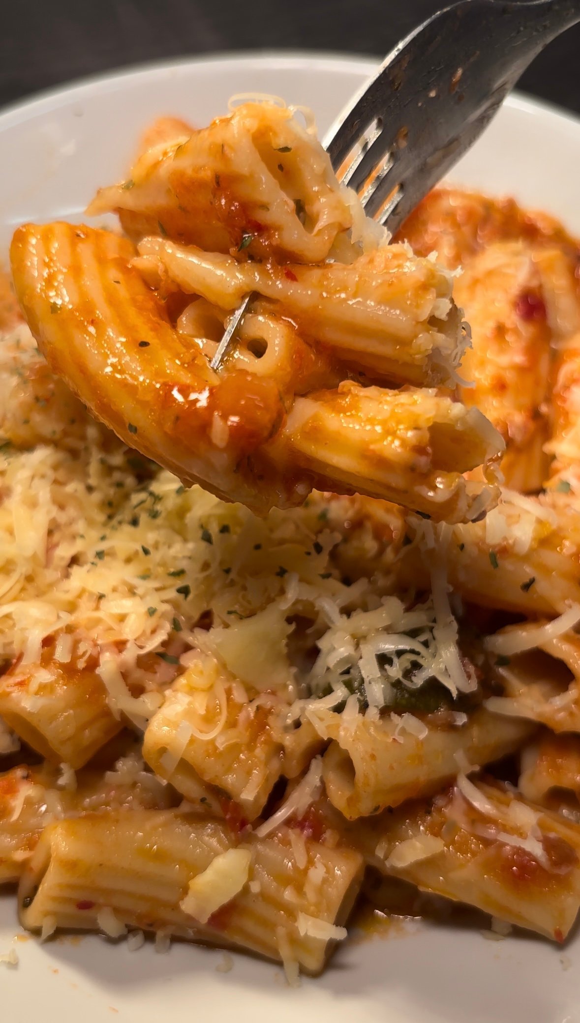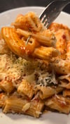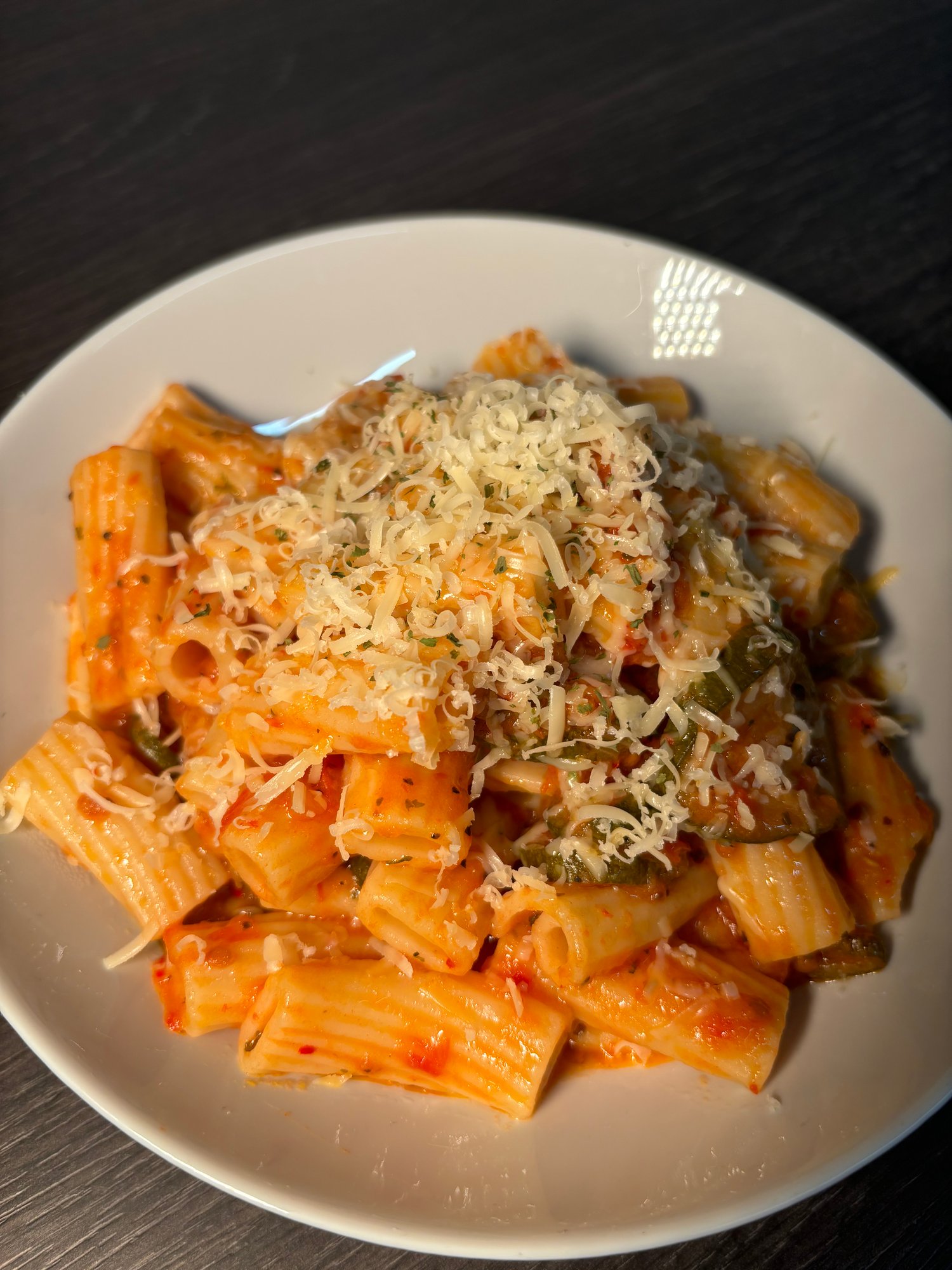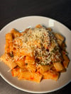 A comforting homemade pasta dish made with a rich, slow-cooked tomato sauce blended with fresh chillies for gentle heat. The sauce is simmered with caramelised onions, herbs, and ripe tomatoes until thick and deeply flavoured. Tender sautéed courgette slices are folded into the sauce to add freshness and texture, then tossed with pasta so every piece is coated in the vibrant, slightly spicy tomato base. Finished with a generous sprinkle of grated cheese and a touch of herbs, this dish is simple, wholesome, and packed with bold, homemade flavour.