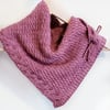 I was inspired by the rosy color of this yarn, in a colorway aptly named Phlox, to design something for springtime. I always like to have a little cowl or shawl to wrap around my neck on chilly spring mornings, and this shawlette is the perfect size to keep with you. The asymetrical triangle shape grows from the tip out and makes customizing the size easy. And both the cable and texture stitch patterns are completely reversible, so there is no wrong side to show.