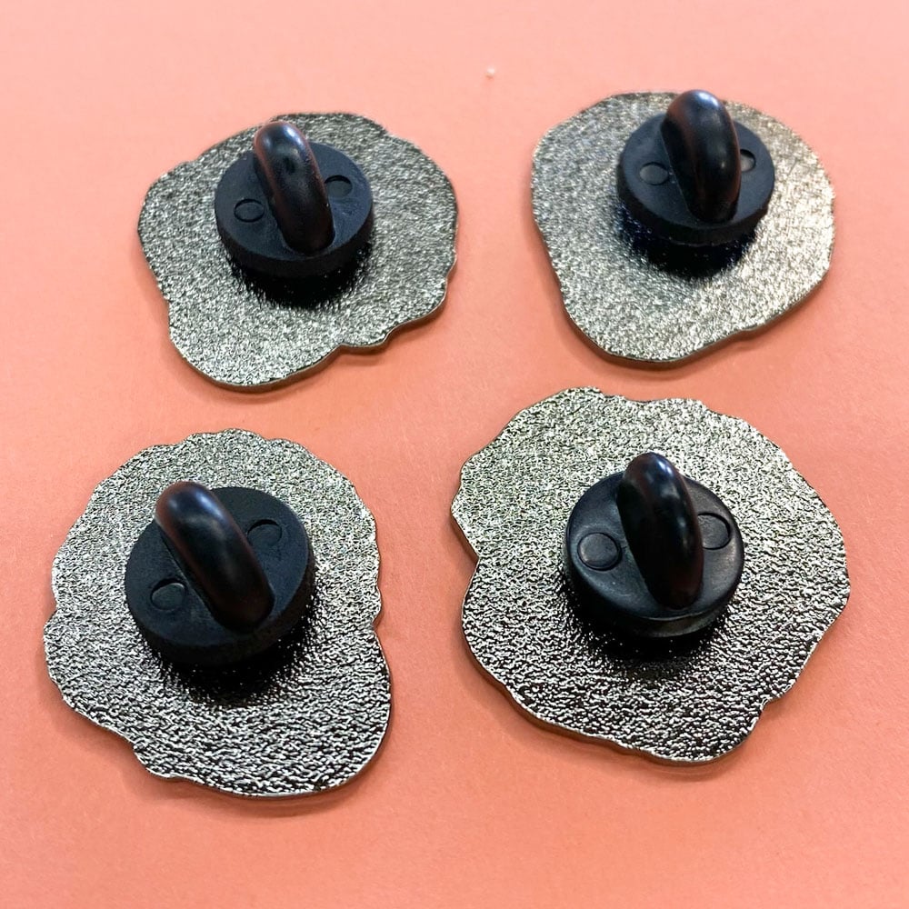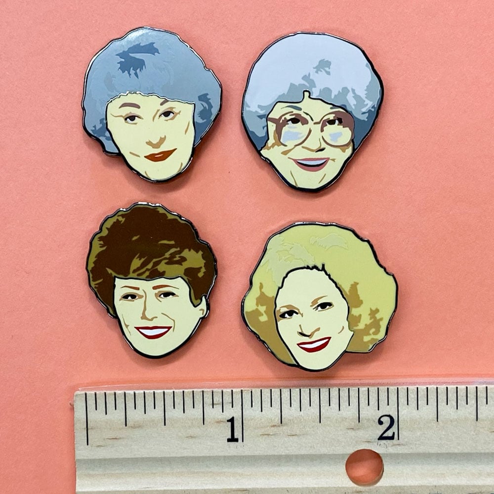 Set of four (4) enamel pins featuring the four Golden Girls characters - Rose, Blanche, Dorothy, and Sophia. Each pin measures 1" at its widest point and comes with a rubber clutch on the back. Pins are hard enamel with a glossy finish.
