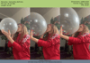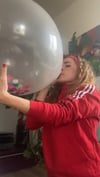 Samantha blows a clear confetti balloon till it pops. She has a little help from her nails, squeezing it at the end.