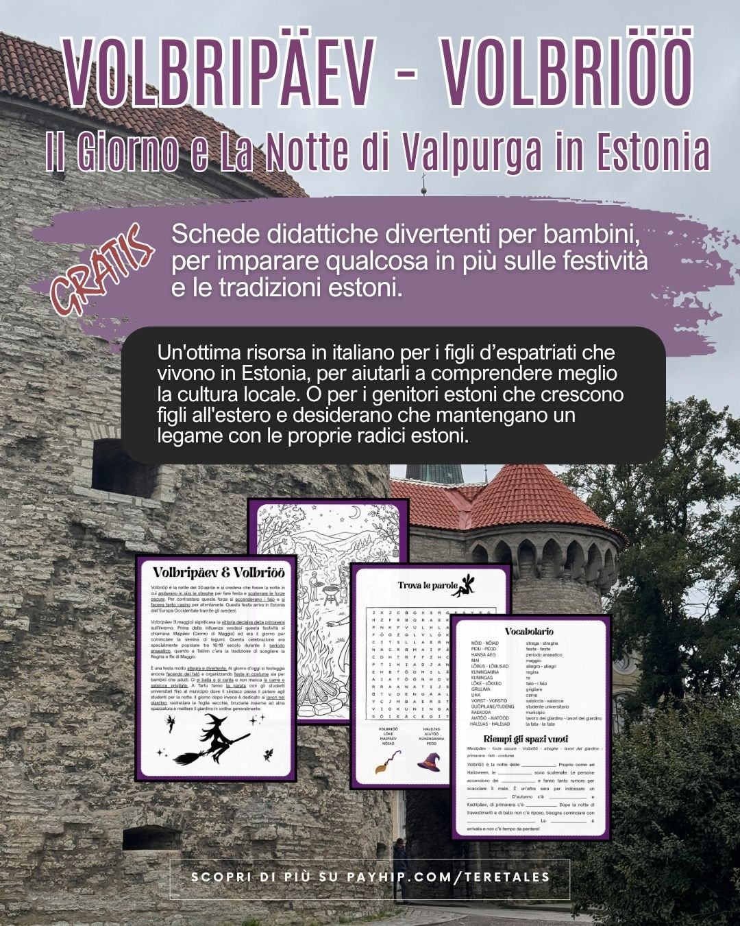 Queste schede didattiche sulla festività estone di Volbripäev/Volbriöö sono un'ottima risorsa in italiano per i figli degli espatriati che vivono in Estonia, per aiutarli a comprendere la cultura e ad integrarsi meglio. Oppure per i genitori estoni che crescono figli all'estero e desiderano che mantengano un legame con le proprie radici estoni.