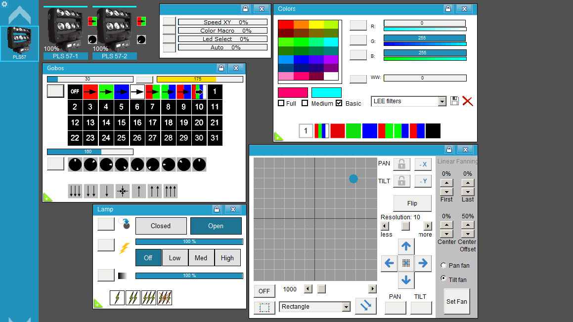 • Movimiento de Pan, con íconos de posiciones predeterminadas (Panel de Gobos).