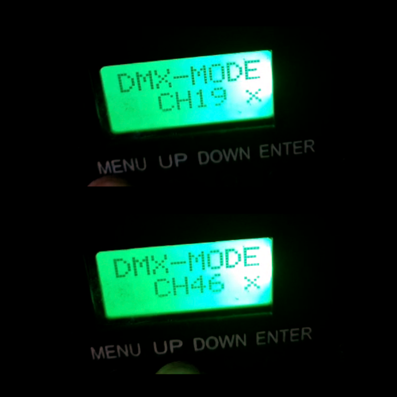 * Verifique, desde el display del equipo, que el menú "DMX-MODE" muestre los modos: "CH19" y "CH46".
