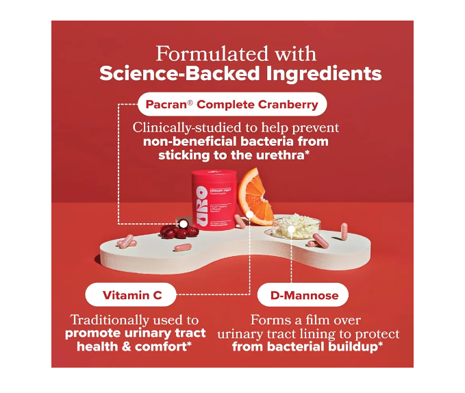 Antibiotic-Free Formula for a Healthy Urinary Tract: URO uses clinically-studied ingredients like Pacran Complete Cranberry for urinary tract health. It also contains Vitamin C and D-Mannose, which forms a film over urinary tract lining cells to protect from bacterial buildup*.