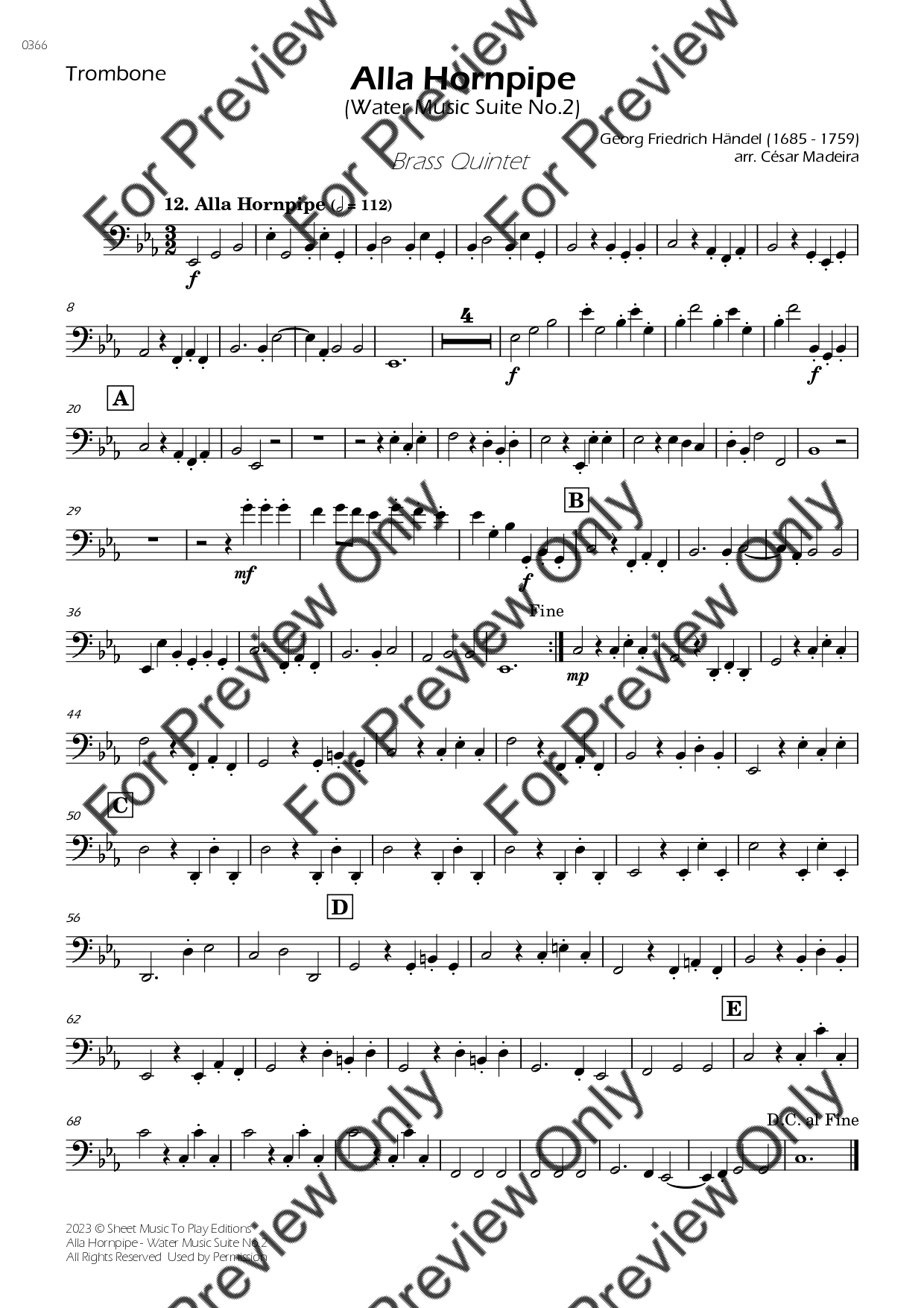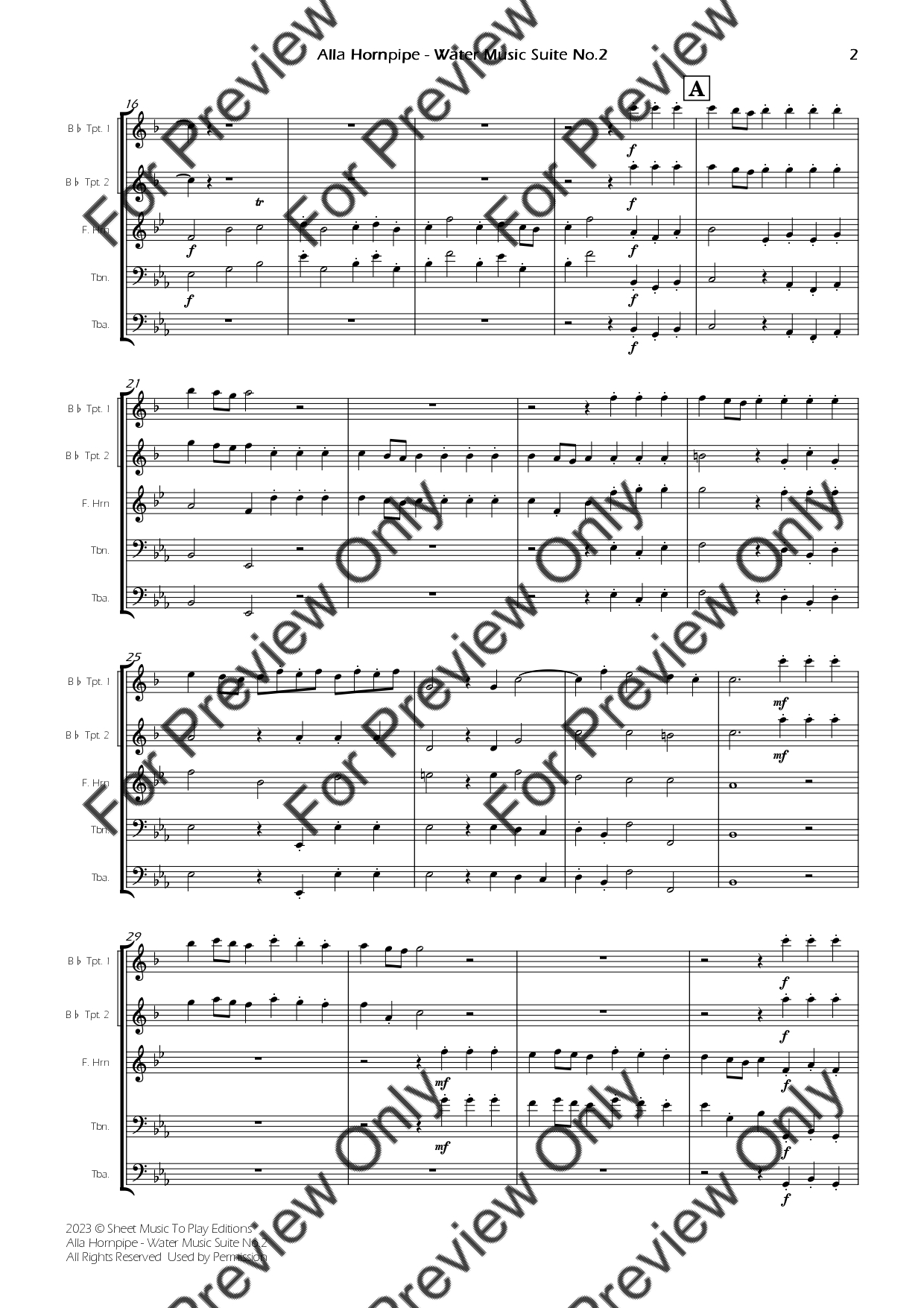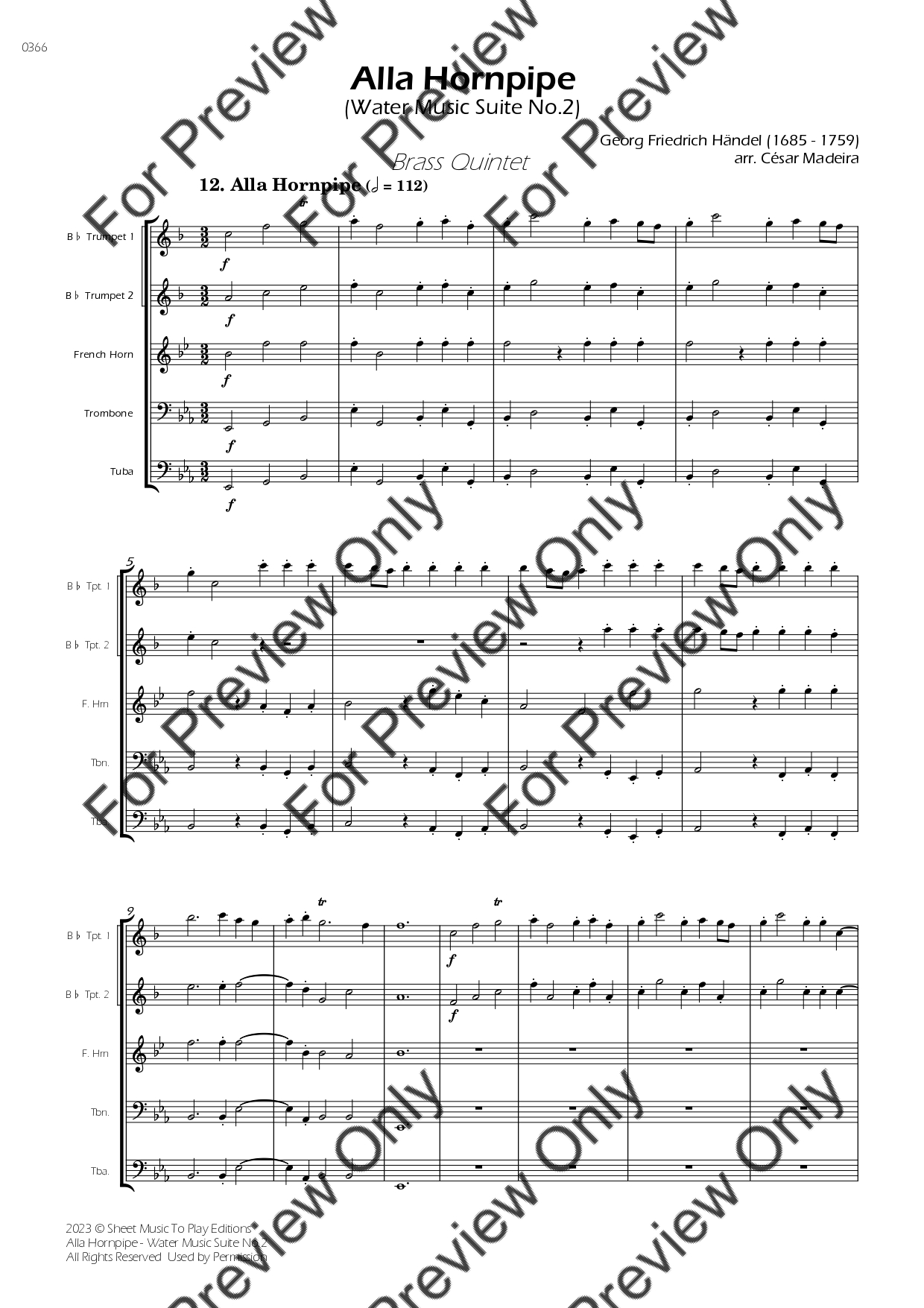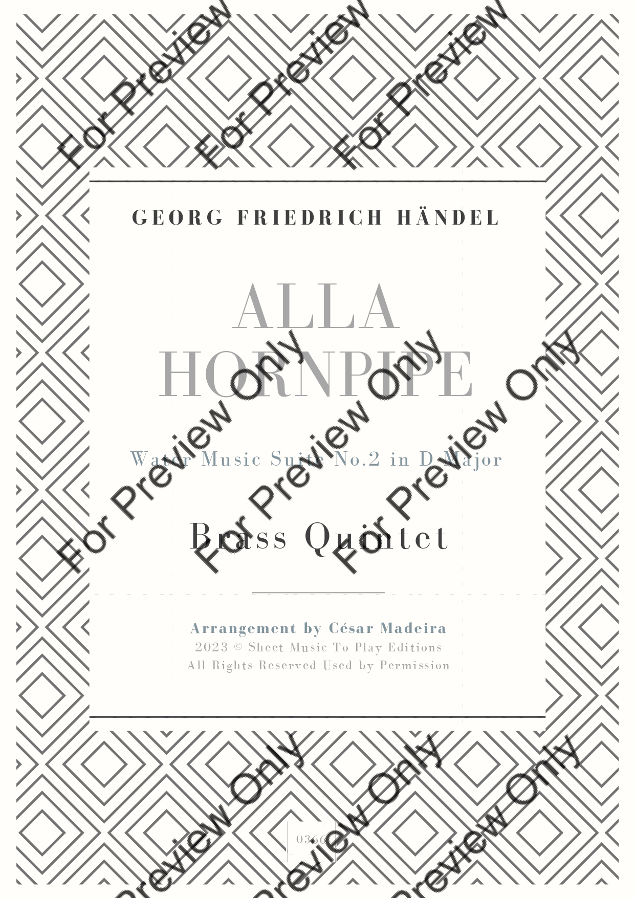 Alla Hornpipe from Water Music Suite No.2 in D Major by Georg Friedrich Handel. Arrangement for Brass Quintet - Bb Trumpet 1, 2, French Horn, Trombone and Tuba. With Full Score and Individual Parts. Have fun!