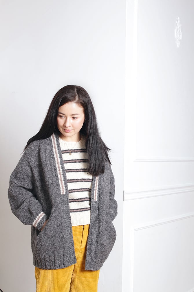 The Ginsan Cardigan is an oversized jacket style sweater that was designed to be paired with the Kinsan raglan pullover as a contemporary twinset. Pattern includes the option to make the cardigan with or without buttons. We think you’ll find some interesting and surprising techniques and shaping in this deceivingly basic-looking and uncomplicated design. Find a photo tutorial here to help with the unique pocket construction developed by Kiyomi.