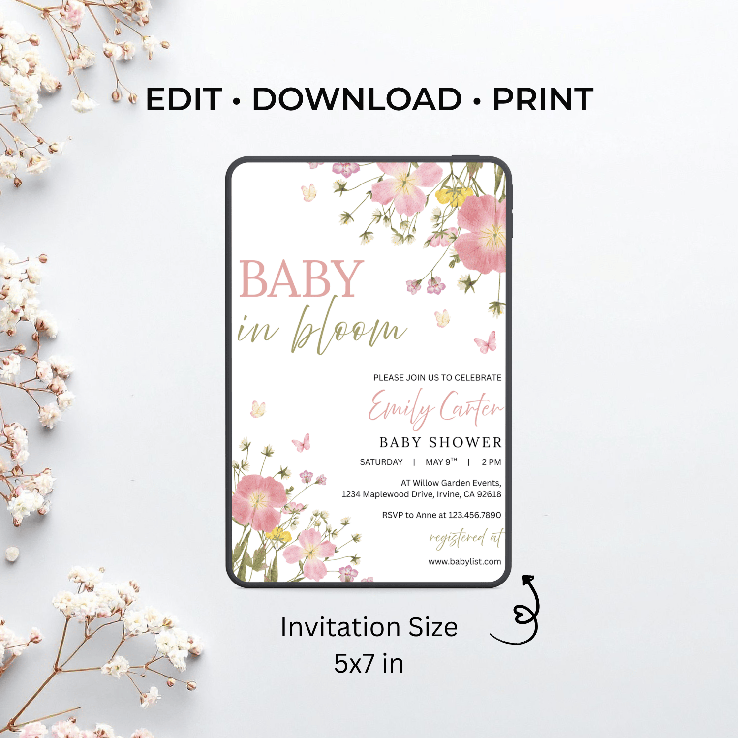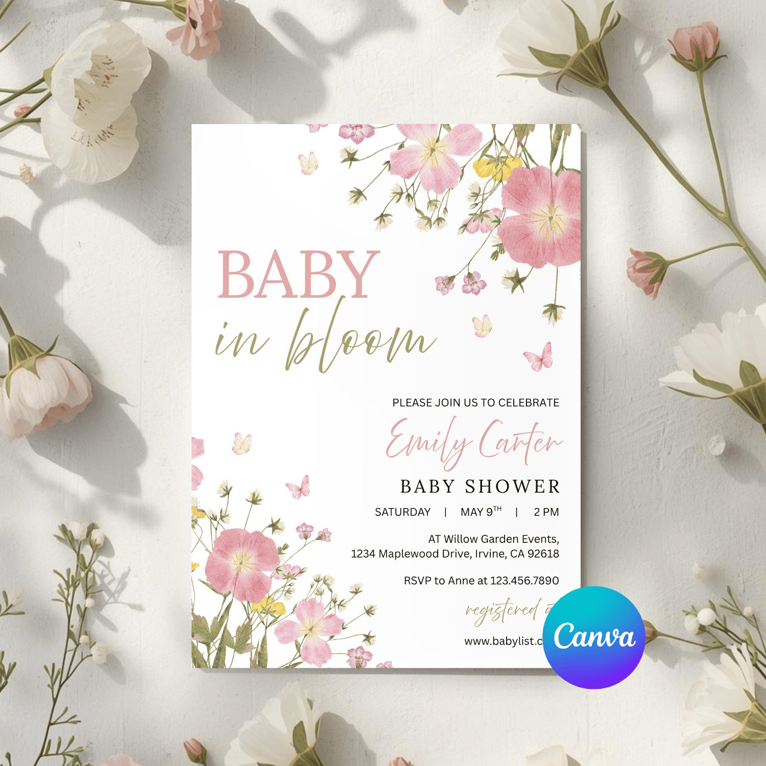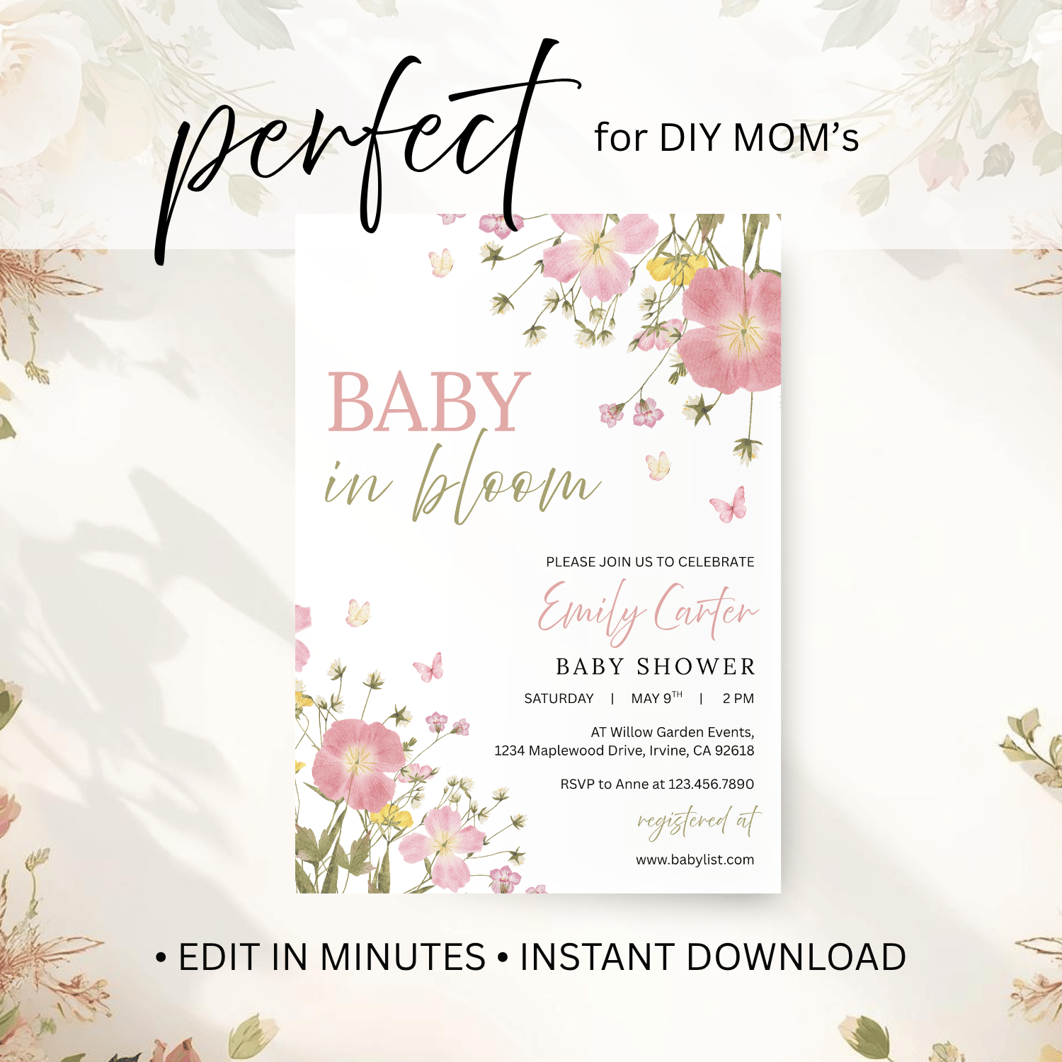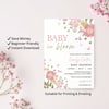 BBY005 Baby in Bloom Baby Shower Invitation Template | Floral Baby Girl Invite | Editable Text in Canva | Instant Download