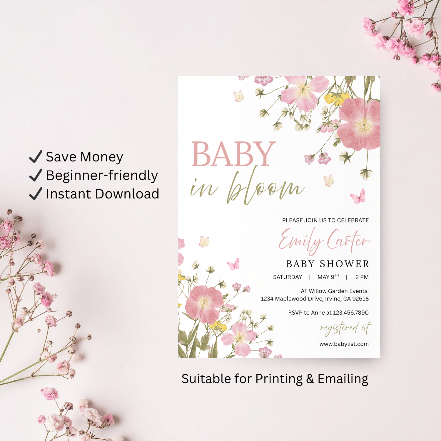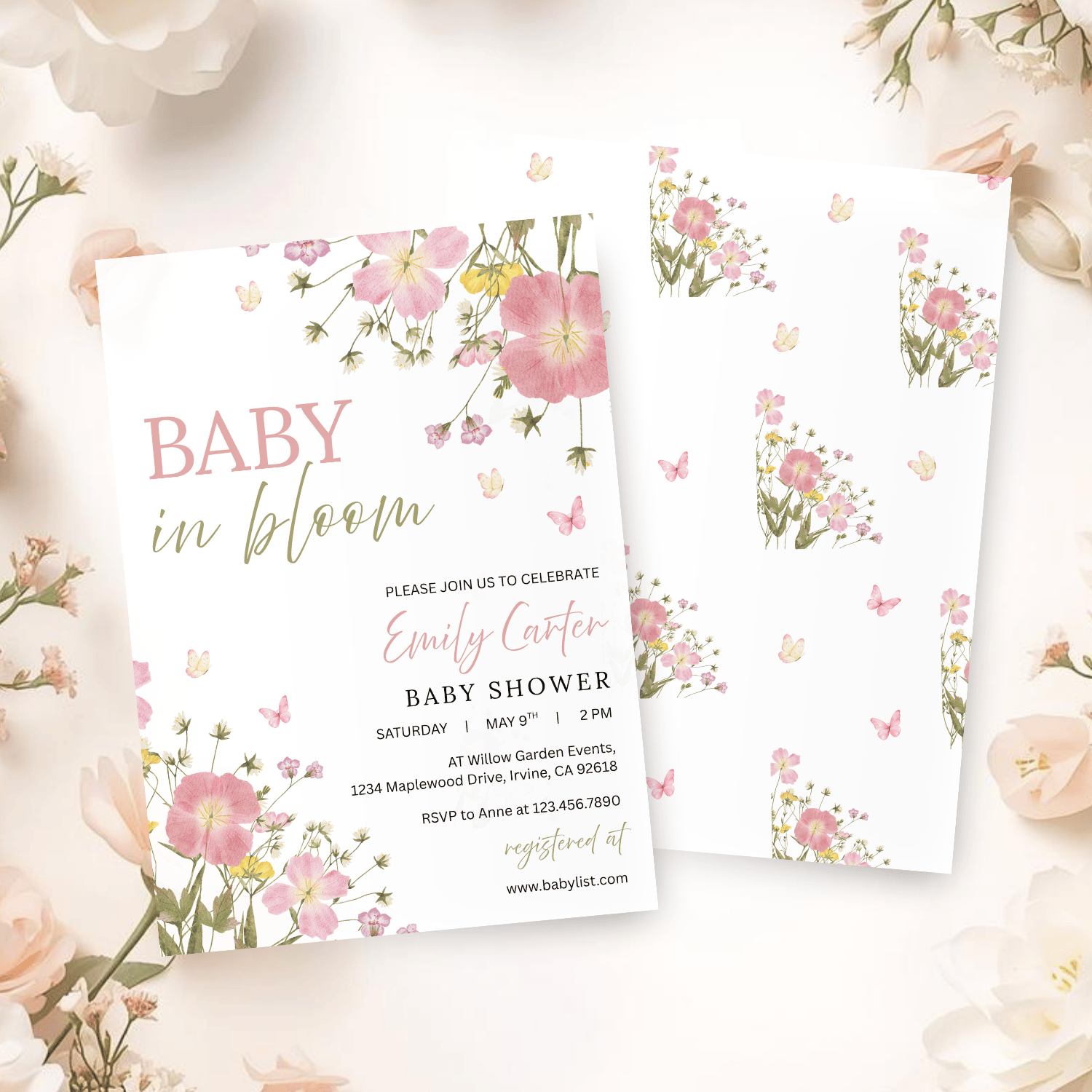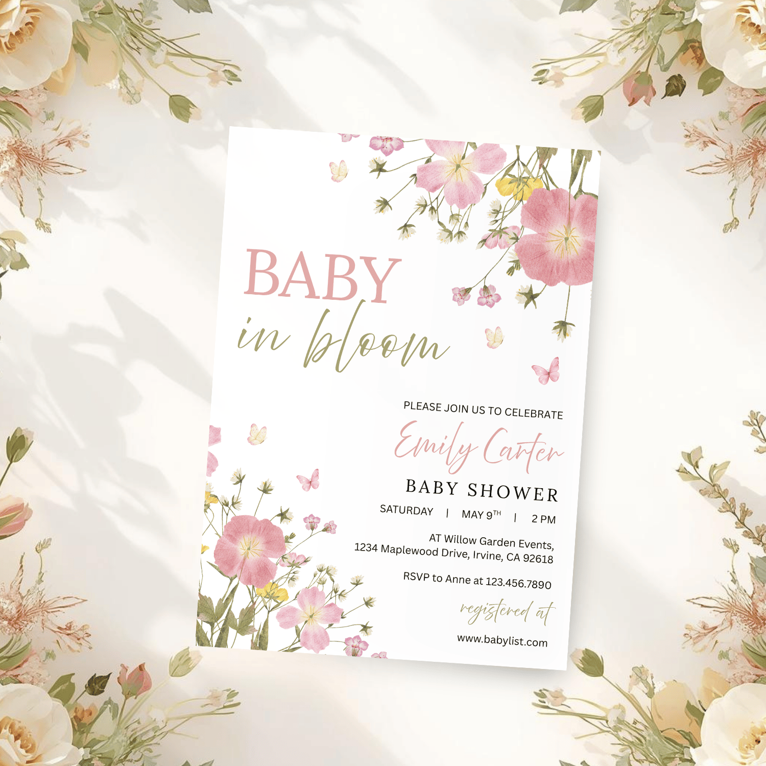 Featuring wildflowers in soft pink and green tones placed at the top right and bottom left corners, along with delicate butterflies scattered around, this invitation feels light, airy, and full of life. The clean white background keeps the design modern, minimal, and easy to read.