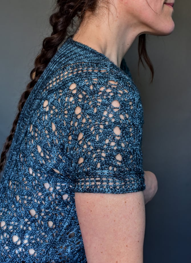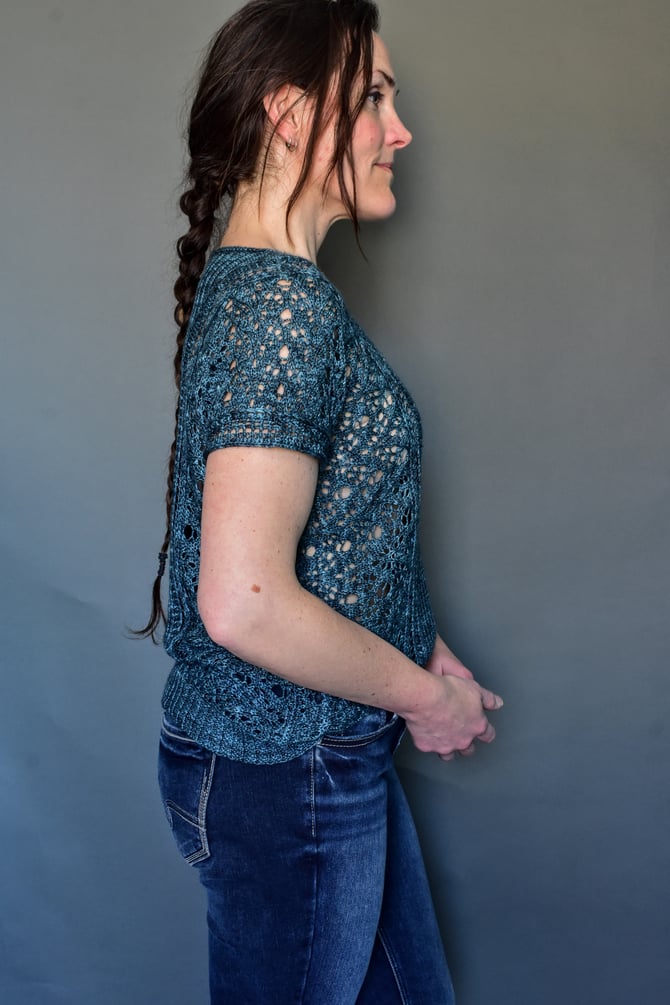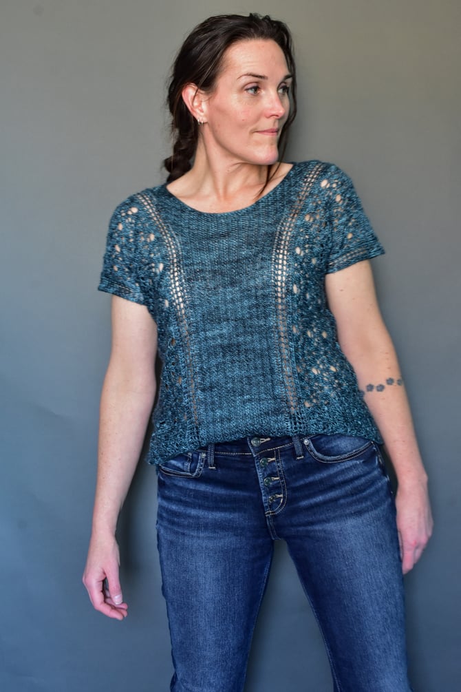 A lacy and modular top-down tee worked in a silky merino. First, front and back panels of ribbing are worked top-down, with short row and decrease shaping at the neck for an interesting detail. Then stitches are picked up along the sides of the panels and the lace is worked to the sides and joined with a 3-needle BO. The armbands are finished with an attached lace edging.