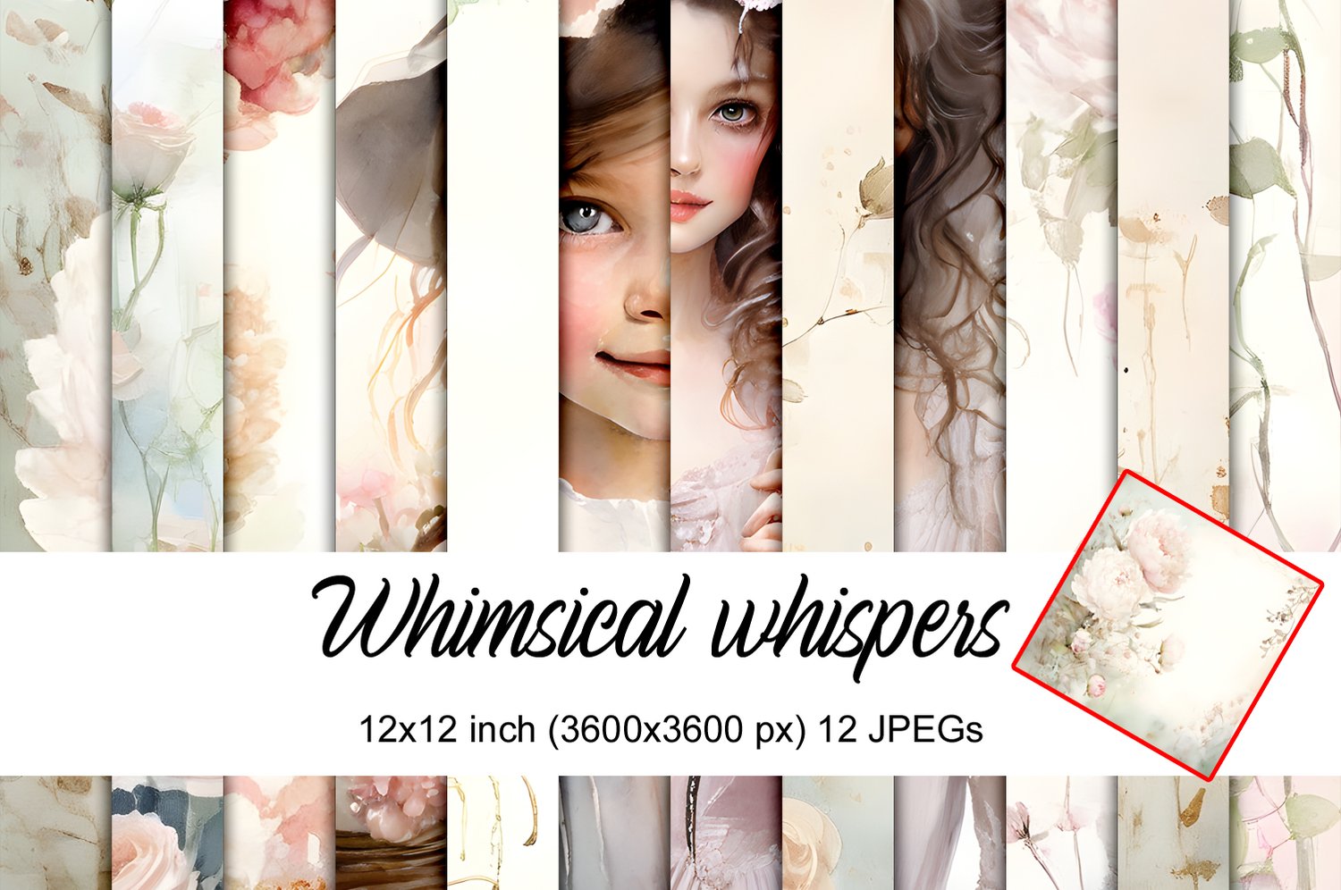 Step into a world of soft light and timeless charm! Our Whimsical Whispers collection is a curated anthology of 12 digital papers that perfectly blend the elegance of Shabby Chic with a touch of whimsical magic. This set features a dreamy mix of delicate watercolor florals, ethereal characters, and soft, aged textures.